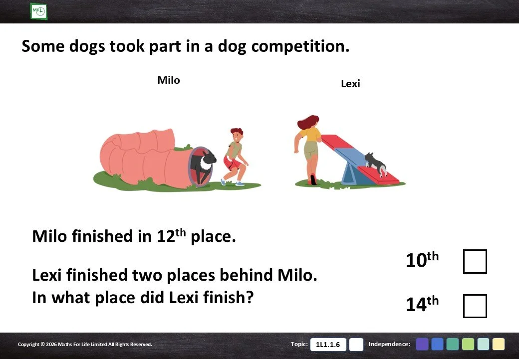 Work out the place a dog finished in a competition by adding or subtracting from ordinal numbers.