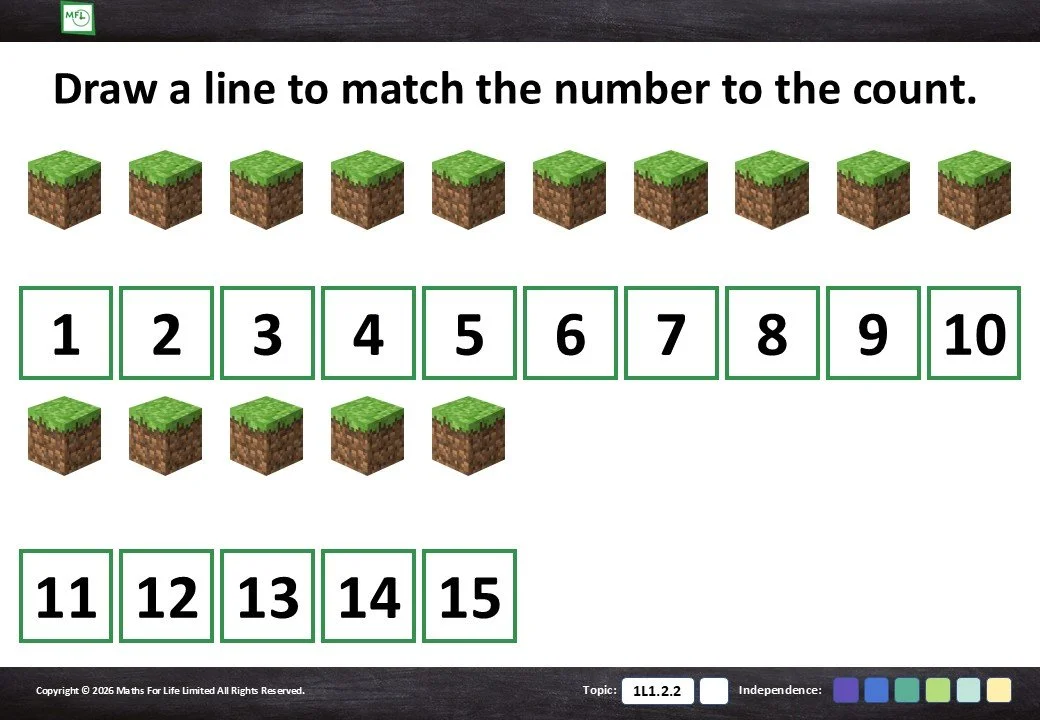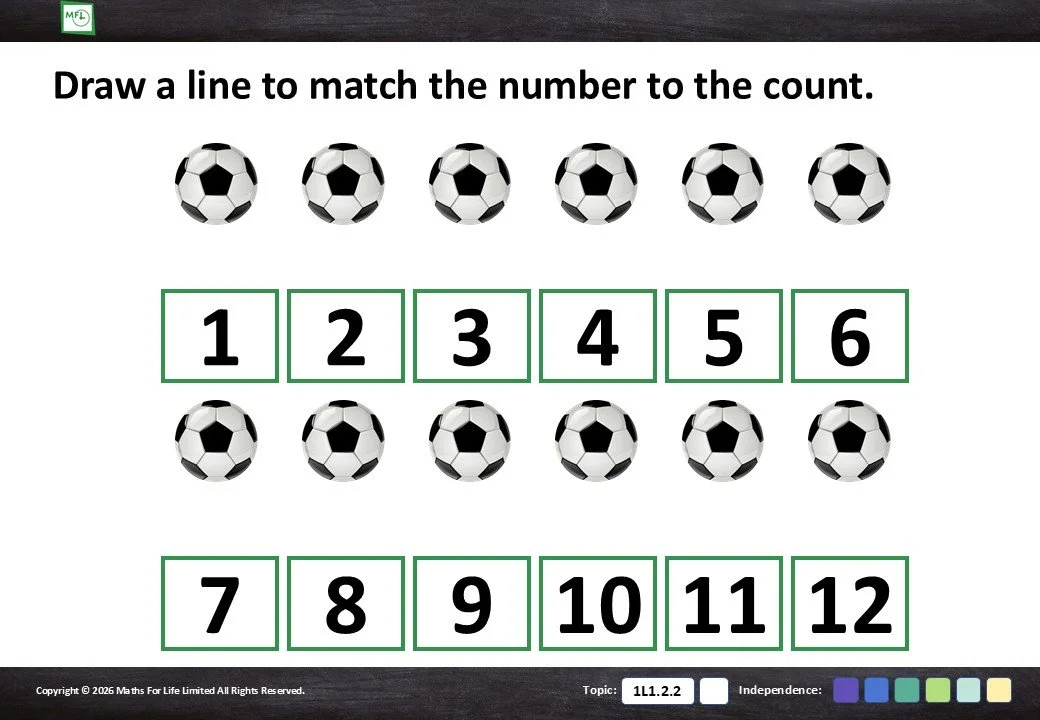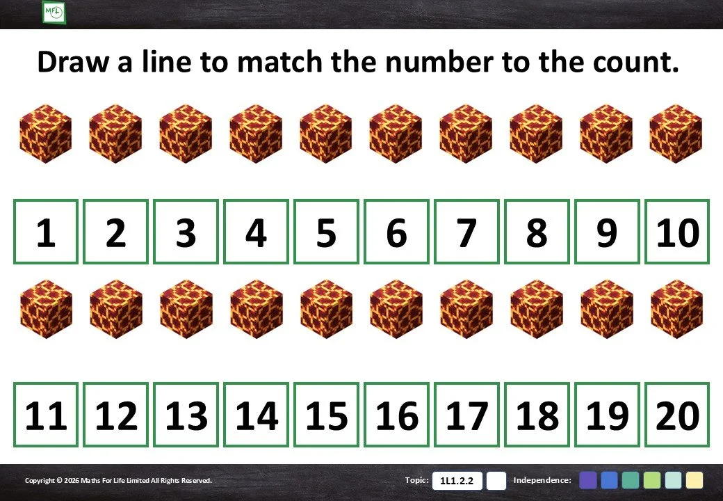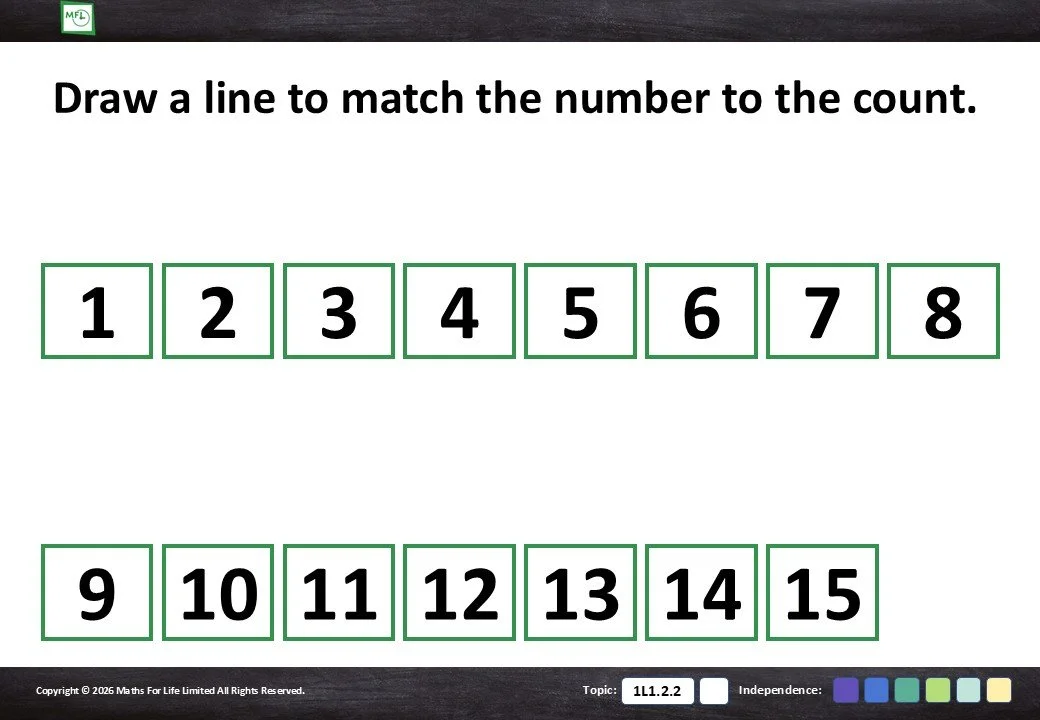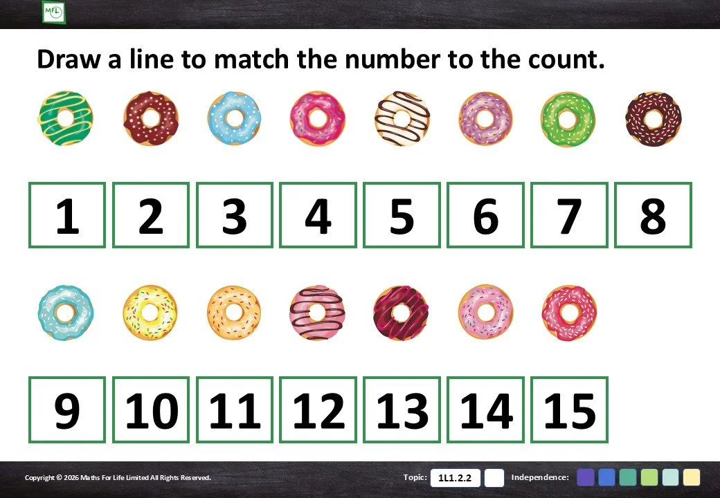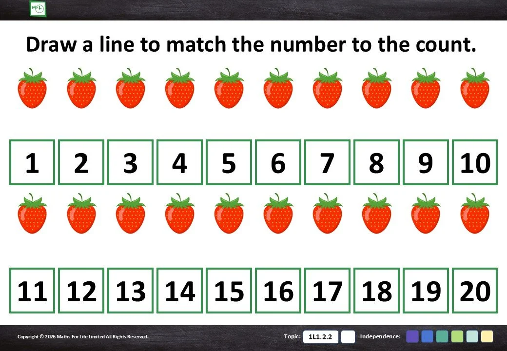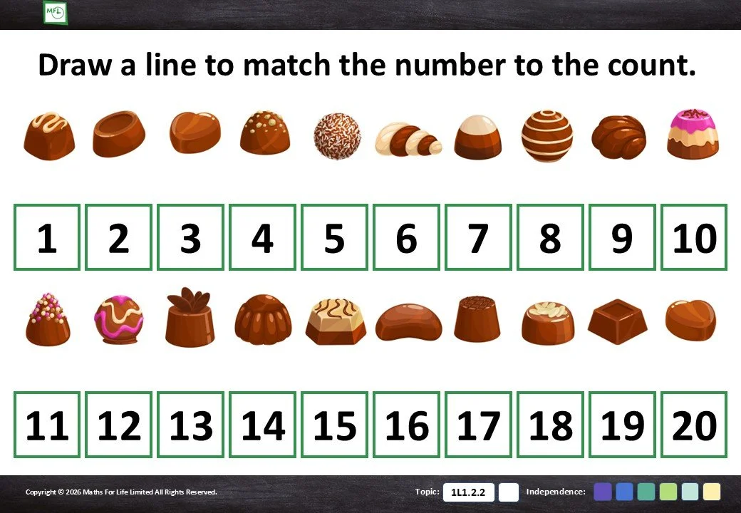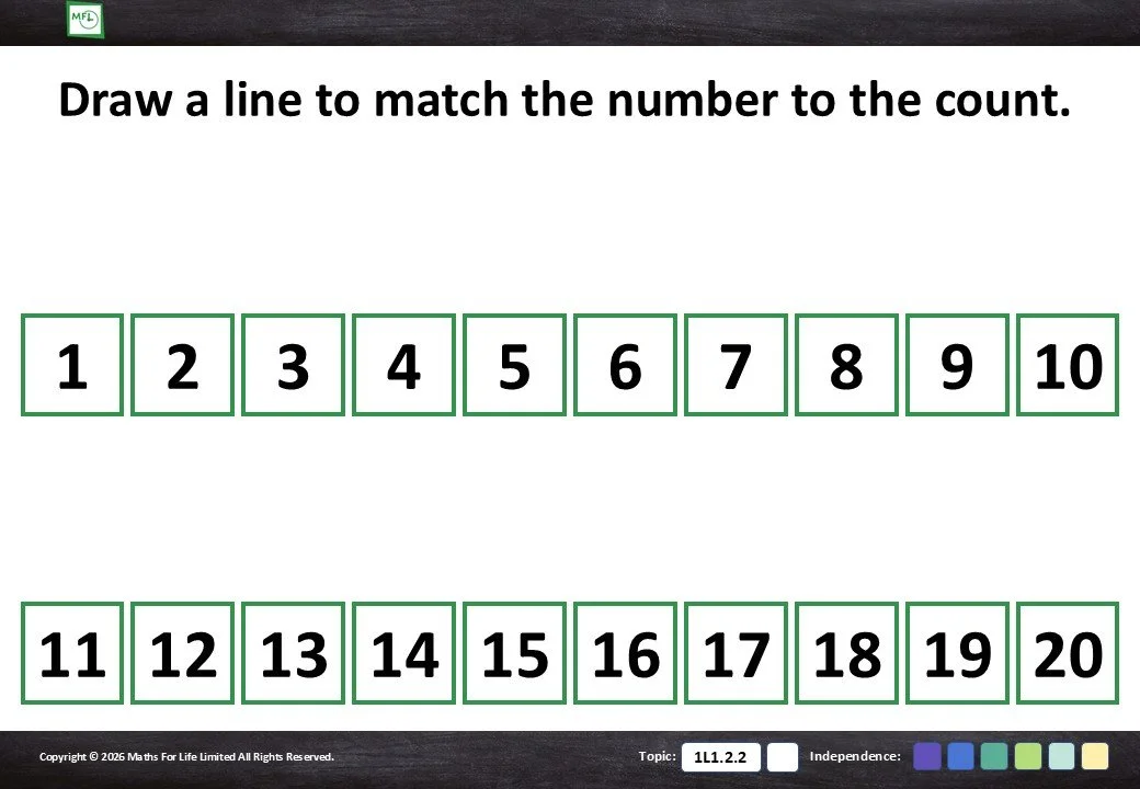 1L1.2.2 One-to-one correspondence Back to Topic 1 menu Back to Topic 1 menu Workbooks Matching items one to oneMatch images while counting from 11 to 20 items.12 pagesEco Ink Version Counting to 12Count whilst matching the objects to the numbers 1-1210 pagesEco Ink Version Counting to 15Count whilst matching the objects to the numbers 1-15.12 pagesEco Ink Version Counting to 20Count whilst matching the objects to the numbers 1-20.15 pagesEco Ink Version Counting to 15Count whilst matching the blocks to the numbers 1-15.15 pagesEco Ink Version Counting to 20Count whilst matching the blocks to the numbers 1-2015 pagesEco Ink Version Counting to 20Count whilst matching the chocolates to the numbers 1-20.15 pagesEco Ink Version Templates and activities Counting 11 to 15 Counting 11 to 20 Number line A3 0-10 Number line A3 11-20 Number line 0-20 Flashcards 0-20 Real life flashcards 1-20 Videos