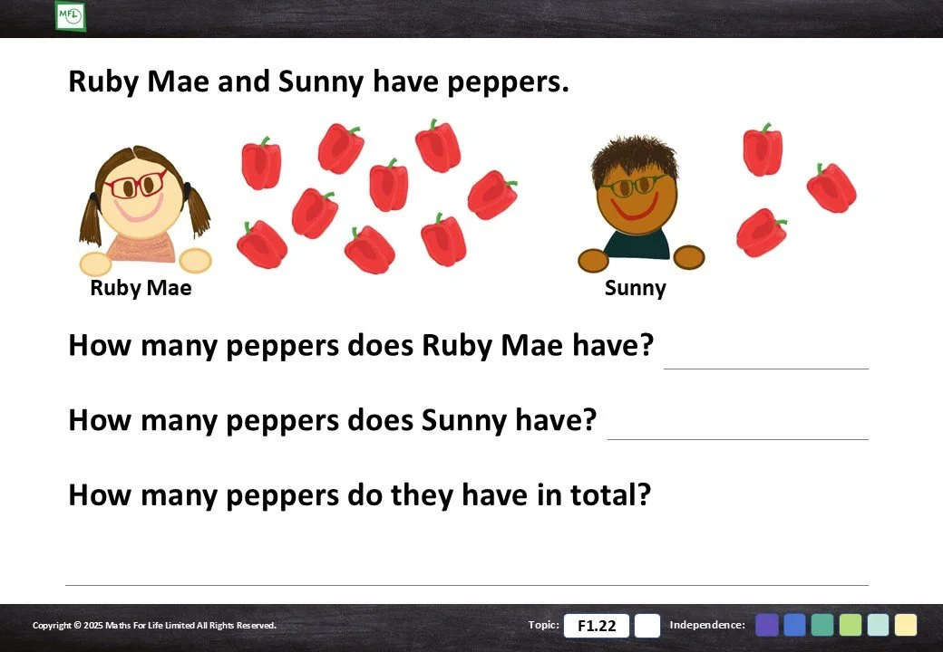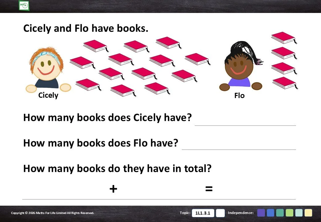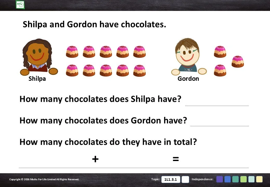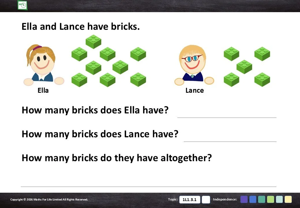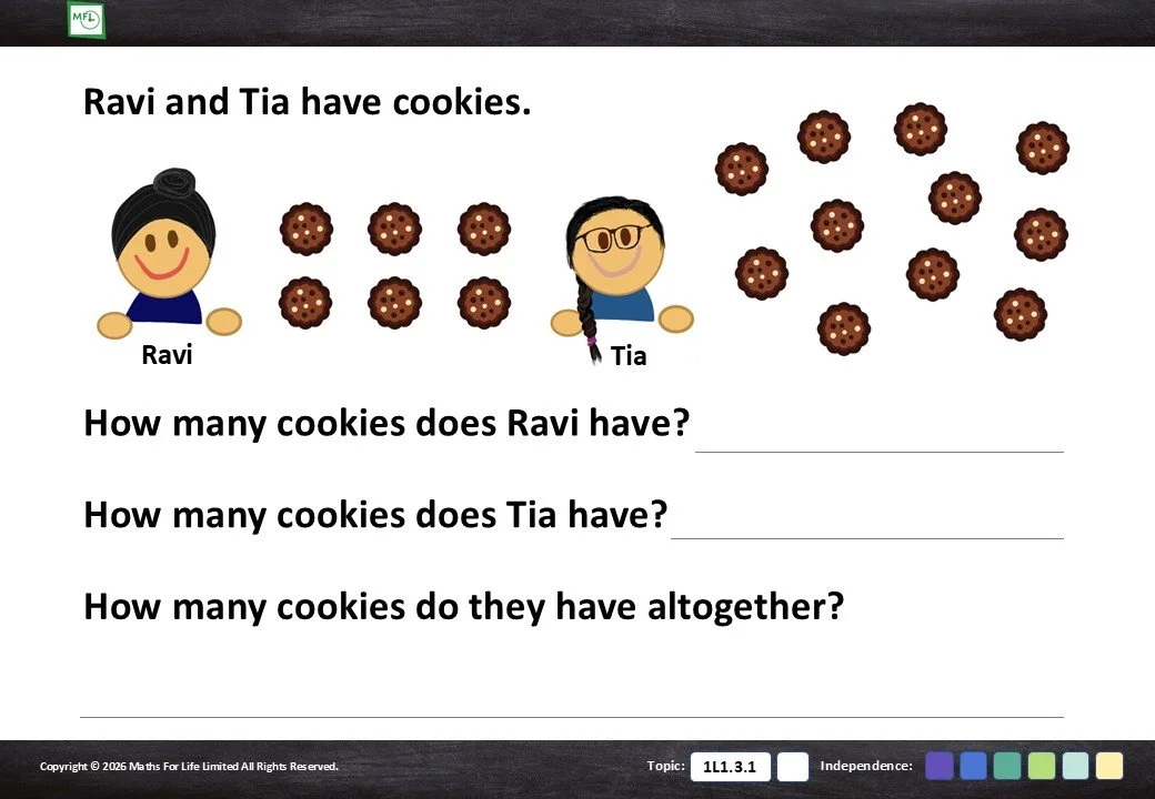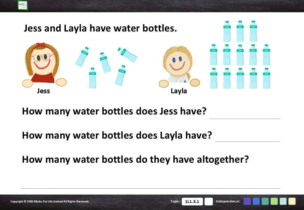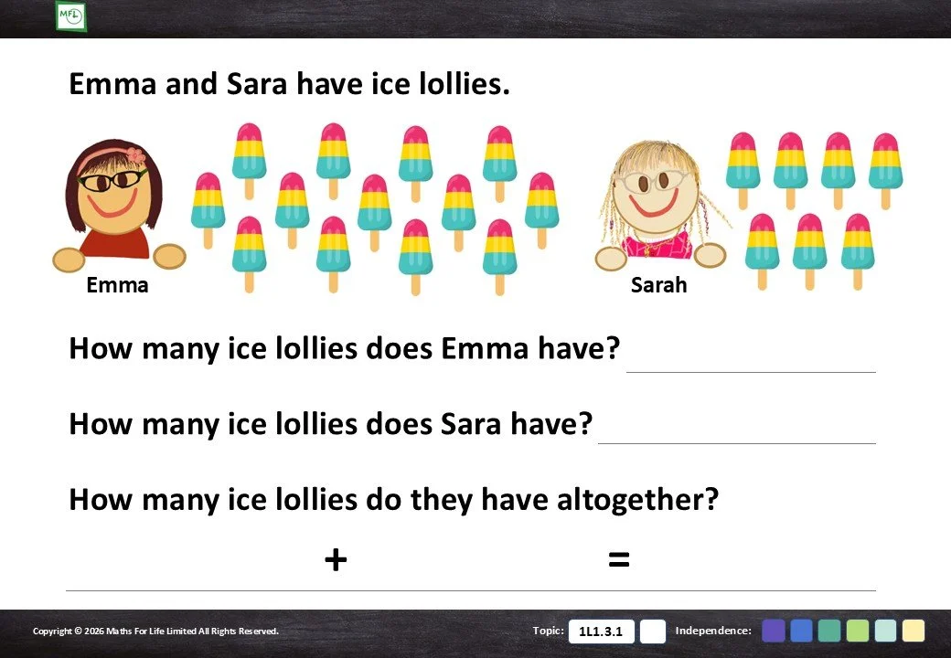 Work out “How many altogether…” for numbers up to 20 with symbols to aid.
