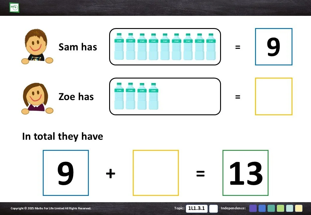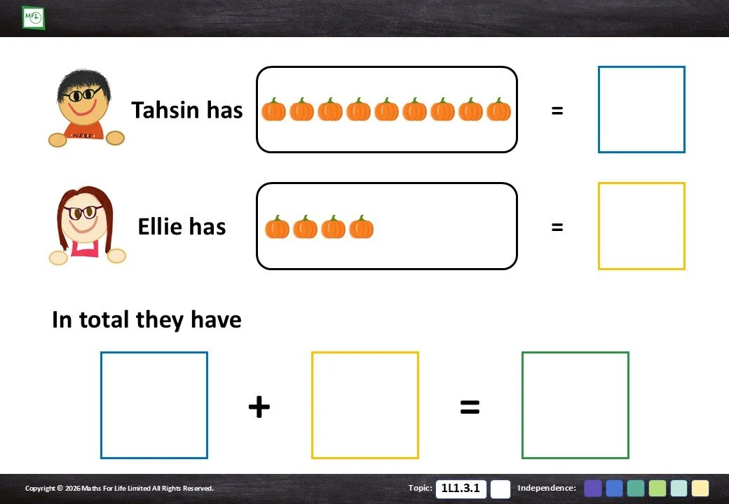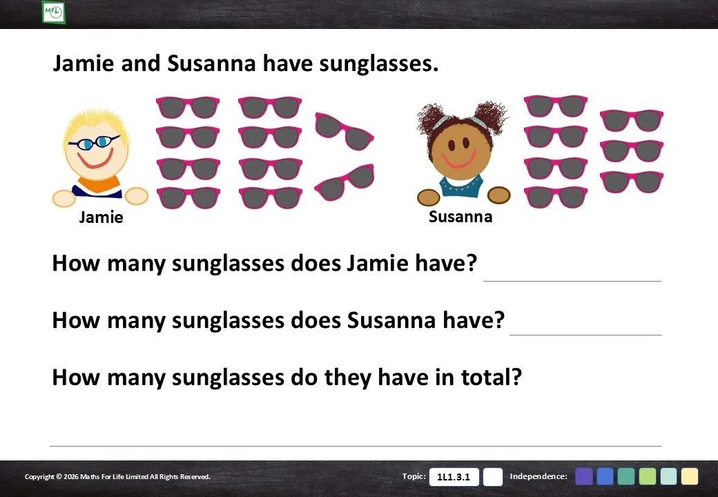 Work out “How many in total…” for numbers up to 20 with symbols to aid.