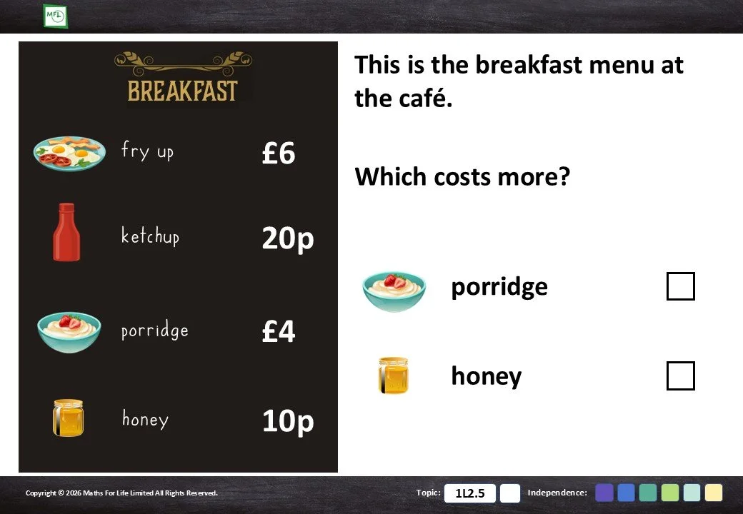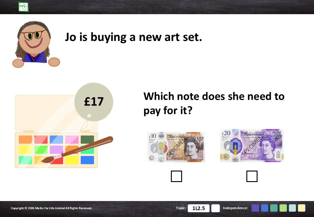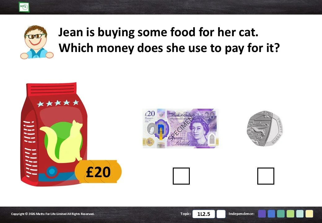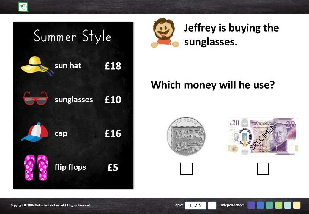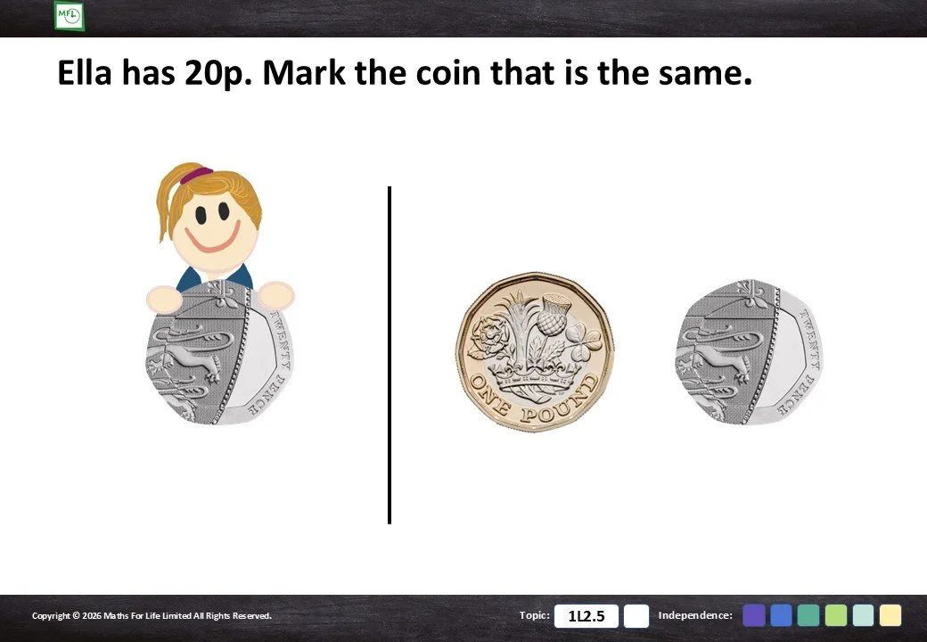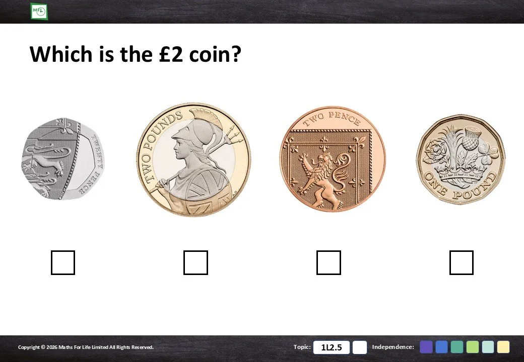 Identify the correct coin or note from a choice of 2 or 3 options.