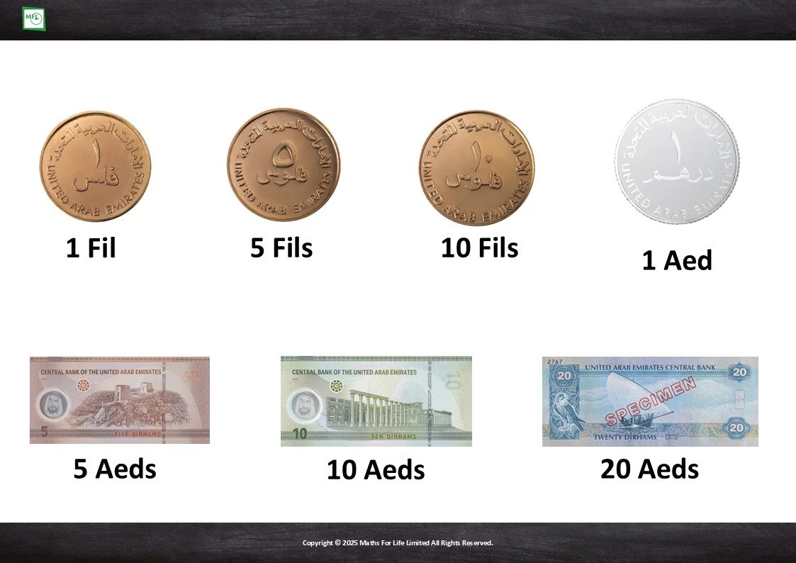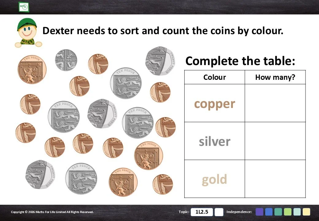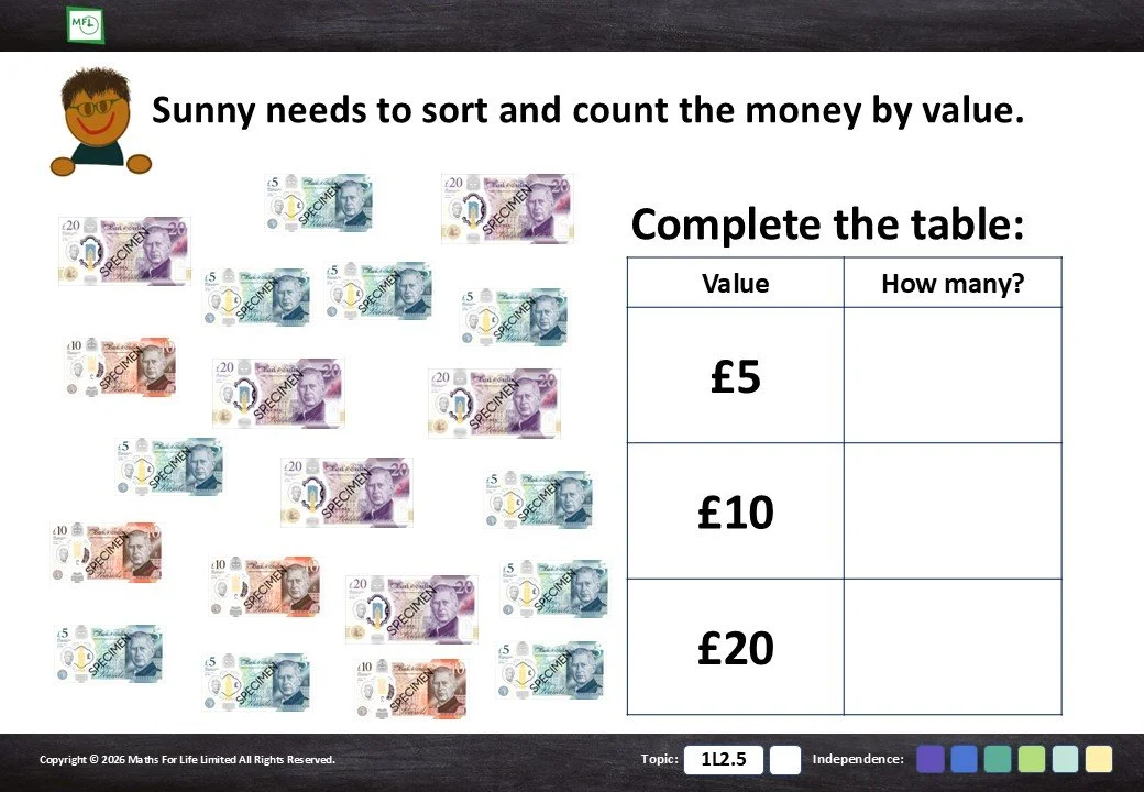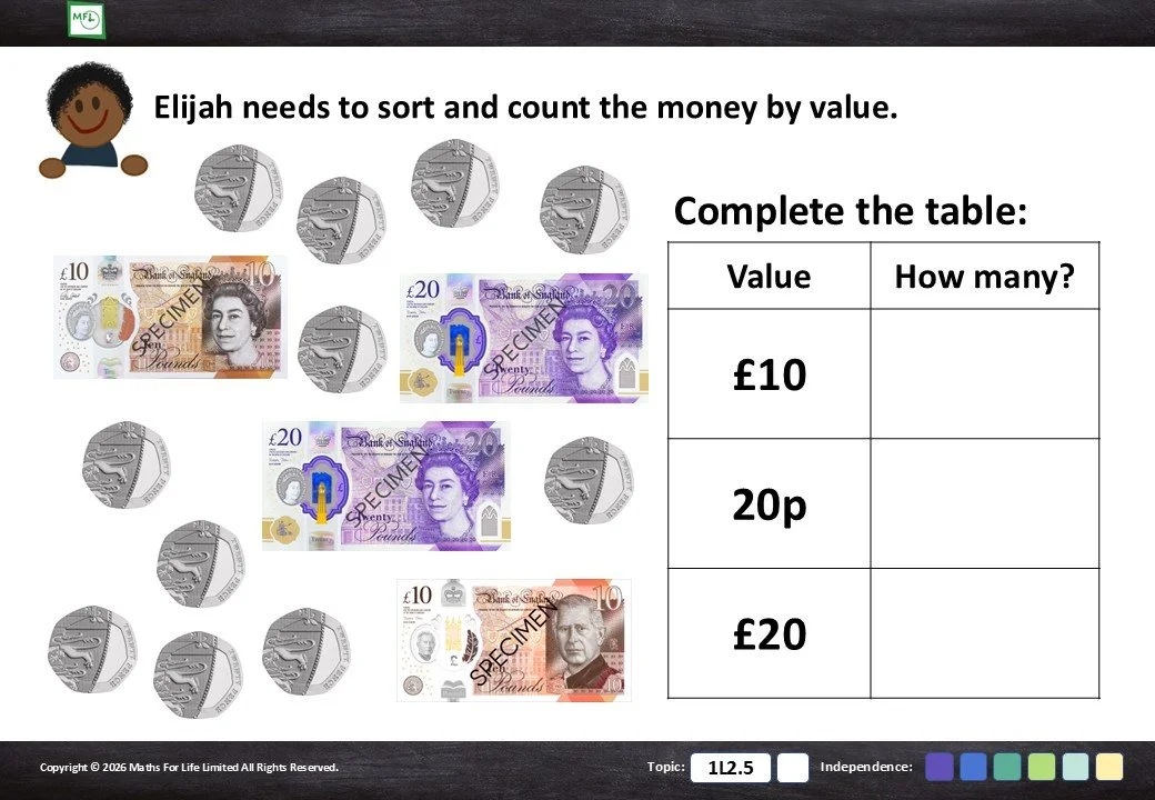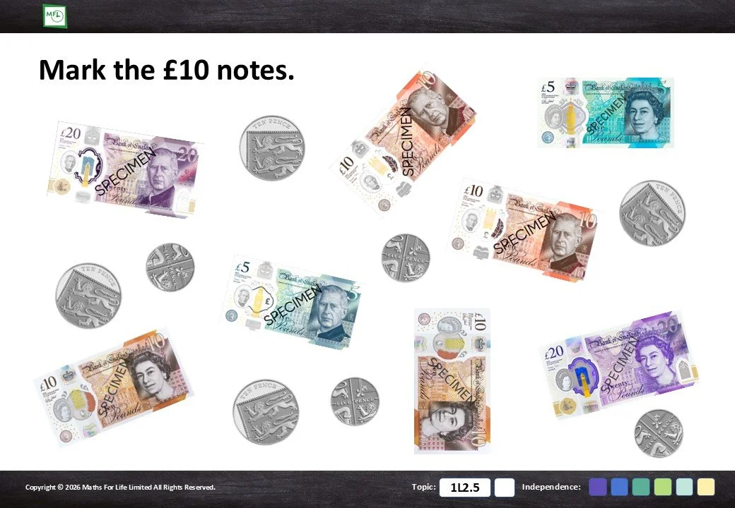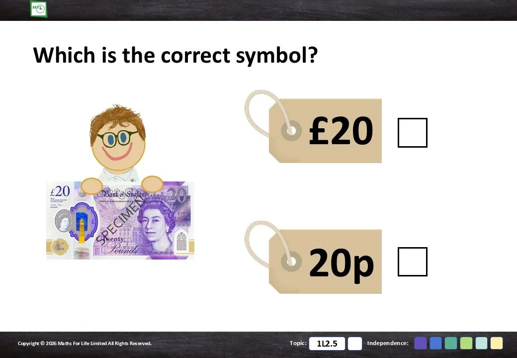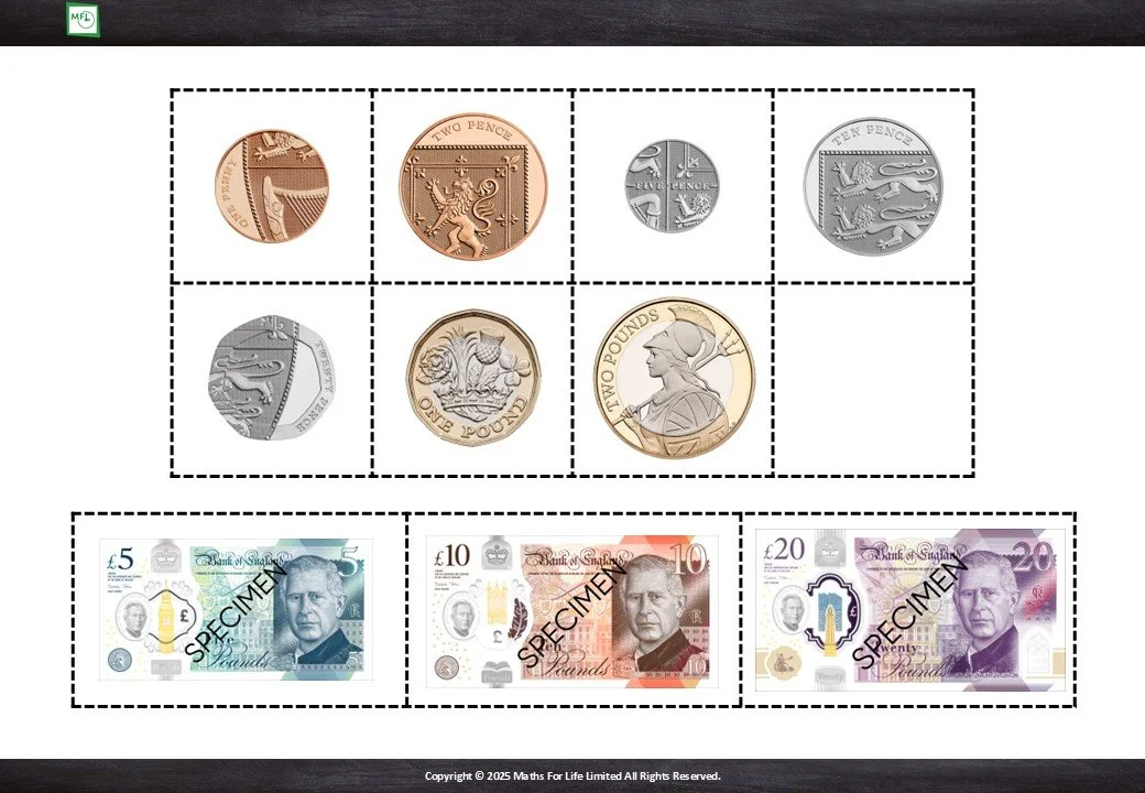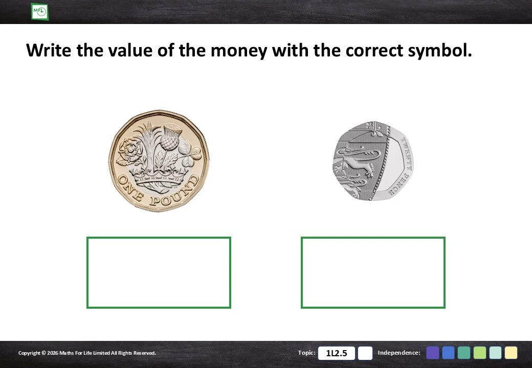 1L2.5 Recognise and write notes and coins with the correct symbols