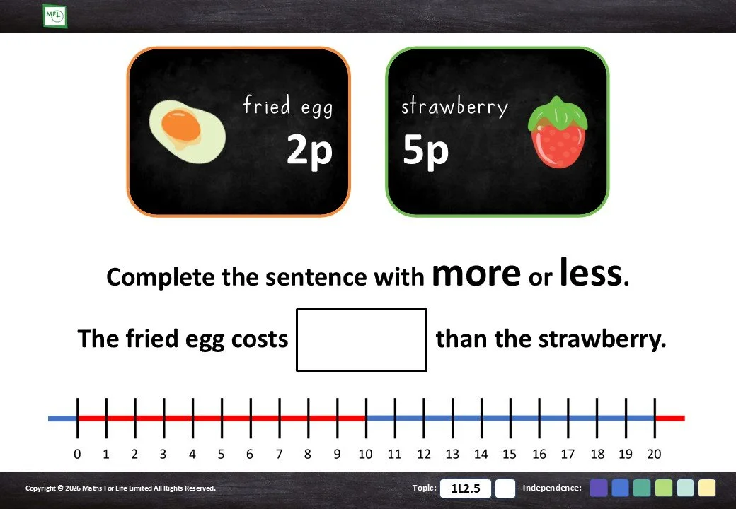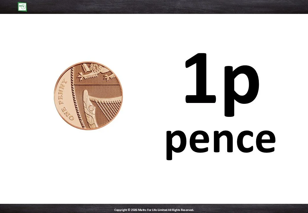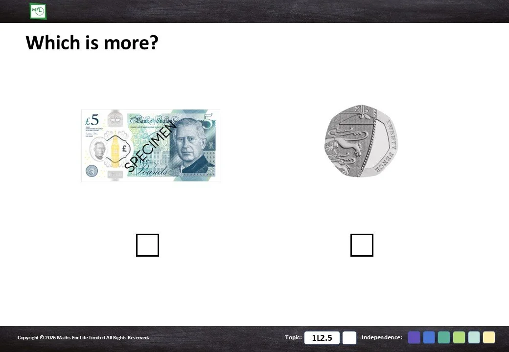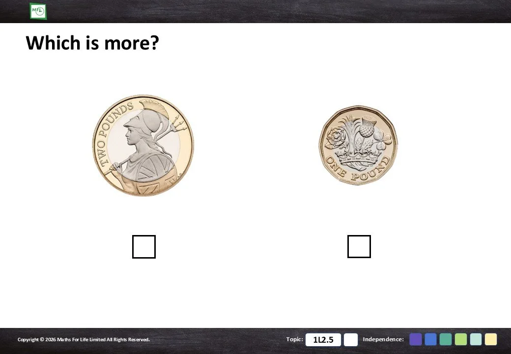 Identify which coin or note is more when comparing pence to pence and pounds to pounds.