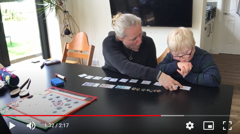 Lance is introduced to money flashcards, showing the coin or note, value in £ or p and a product (which he loves and can associate with).