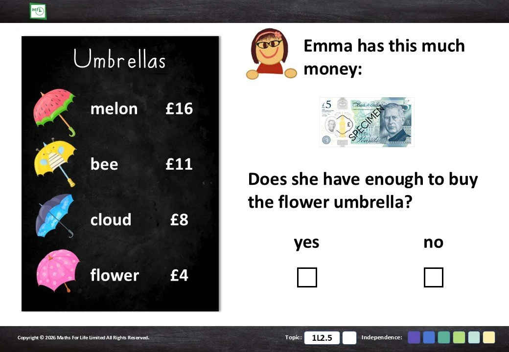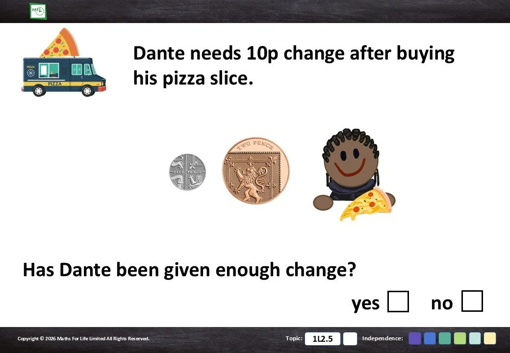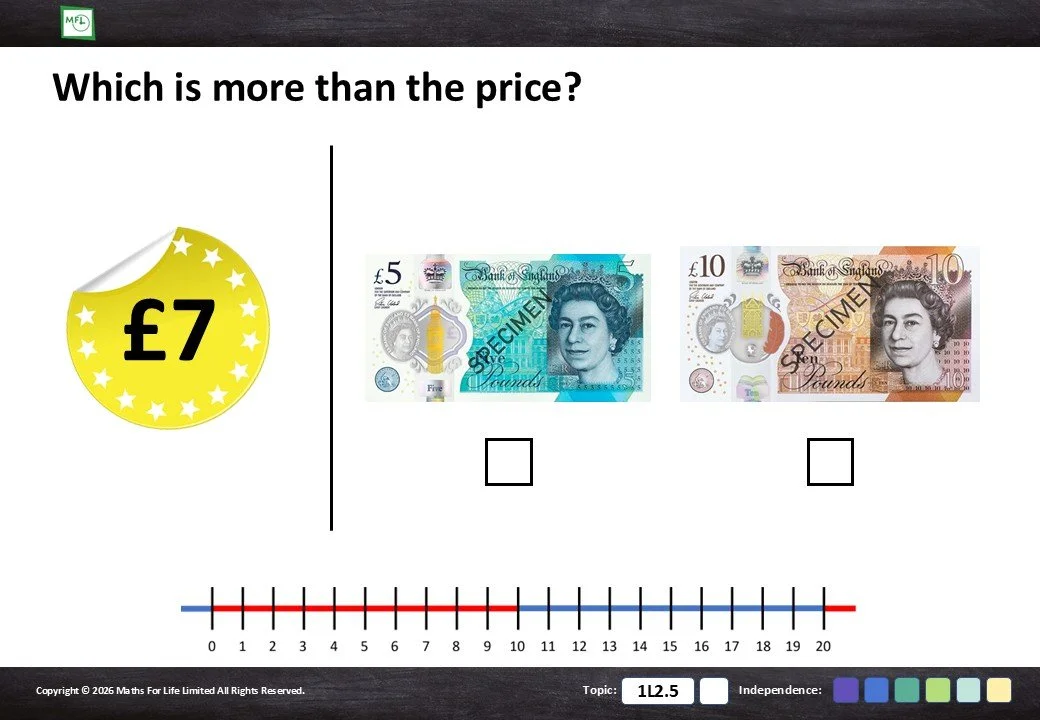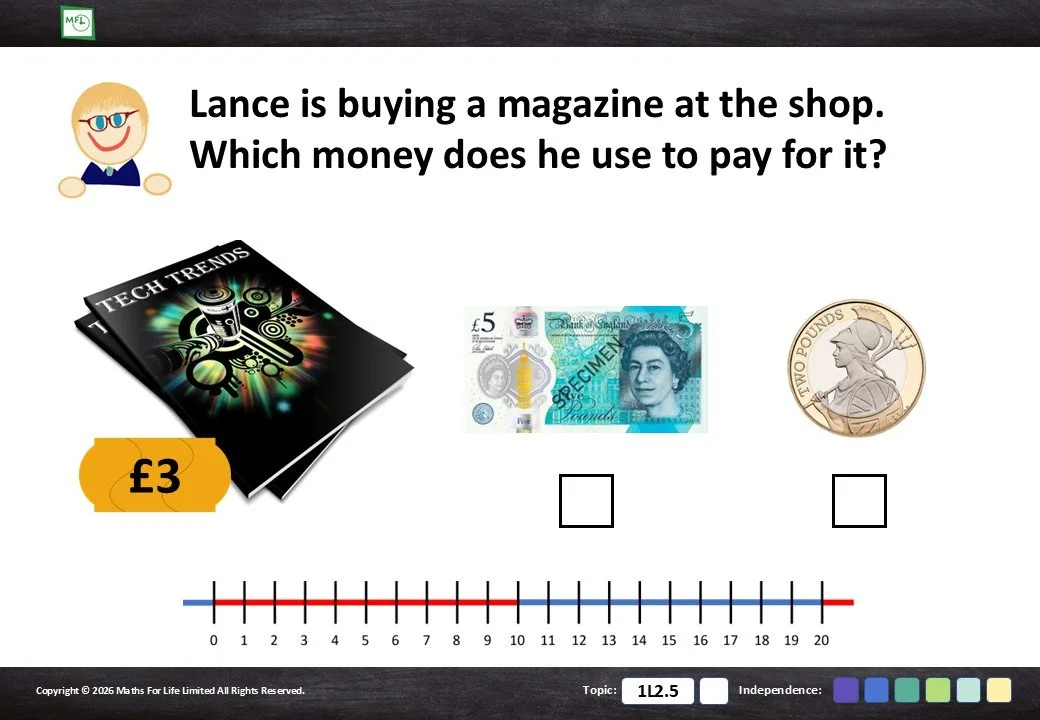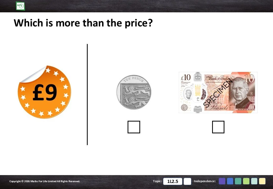 Select the coin or note that is more than the price. Pence and pounds.