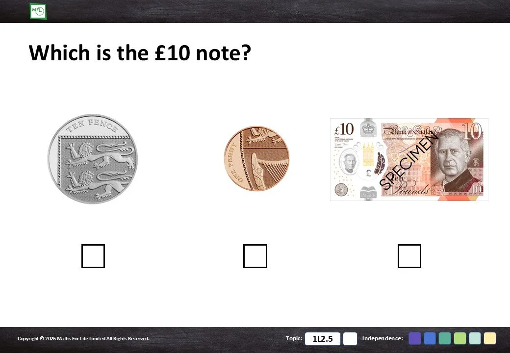 Identify the correct coin or note from a choice of 3 or 4 options.