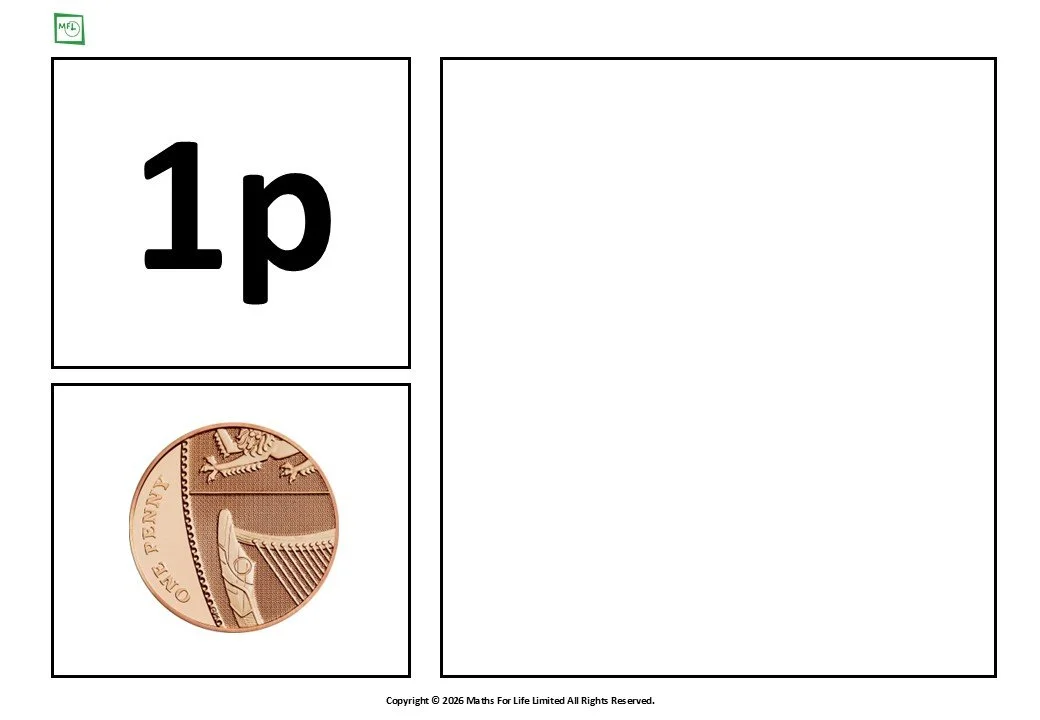 Lance looks at a real coin, finds the matching coin on the worksheet and write the value e.g. 1p next to it. Practising number formation and building an understanding of £ or p. Alternatively, students could also mark or place the coin on the corresponding image.