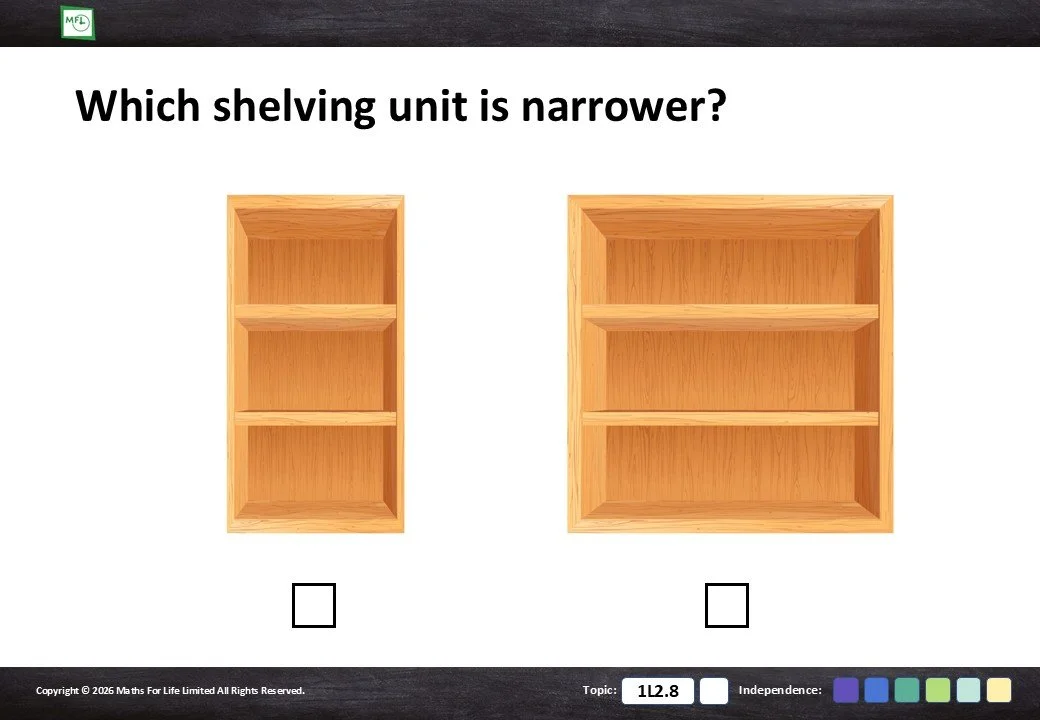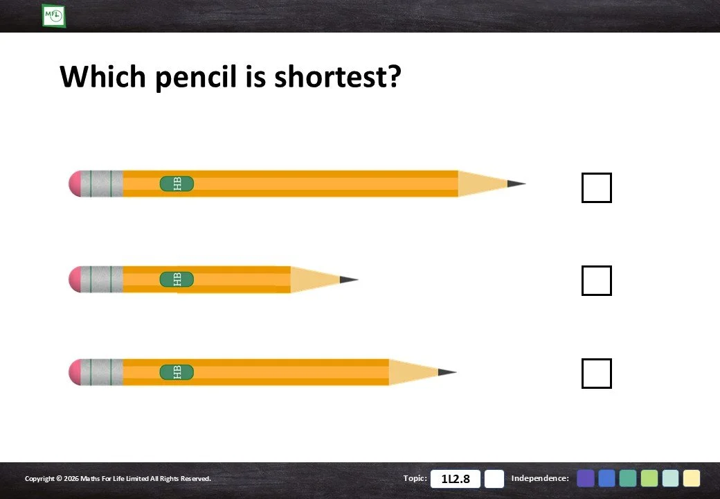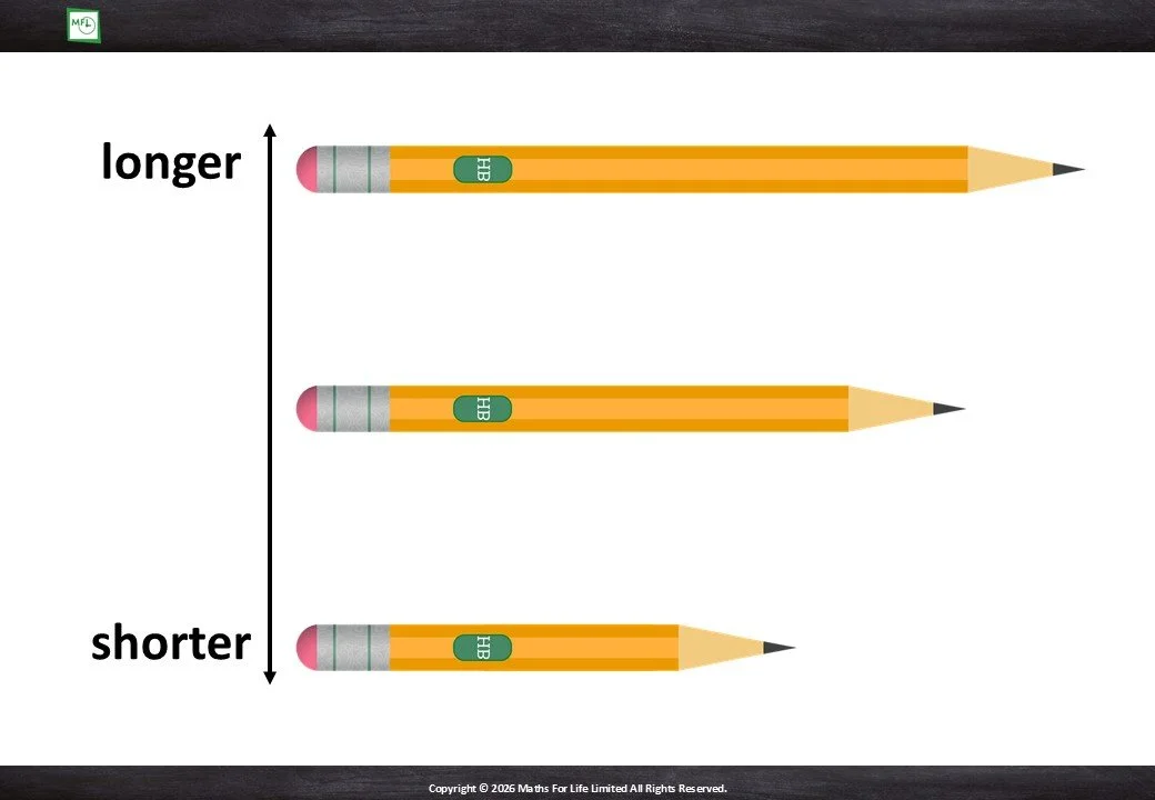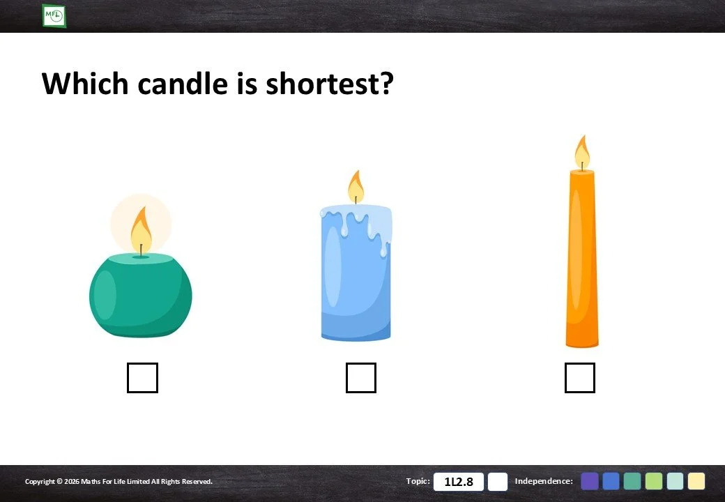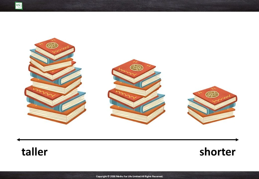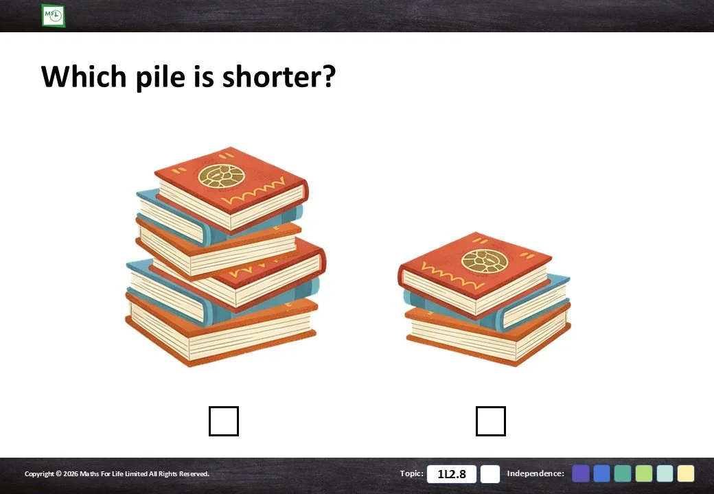 Looking at household items and choosing which is taller/shorter or longer/shorter.