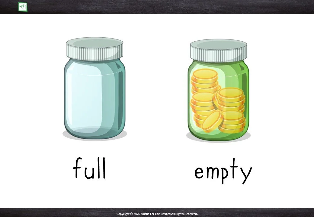 Describing household items using knowledge of 2D and 3D shapes, colour and measure. Using mathematical vocabulary e.g. full/empty, big/small, taller/shorter, curved/straight, heavy/light and making comparison same/different.