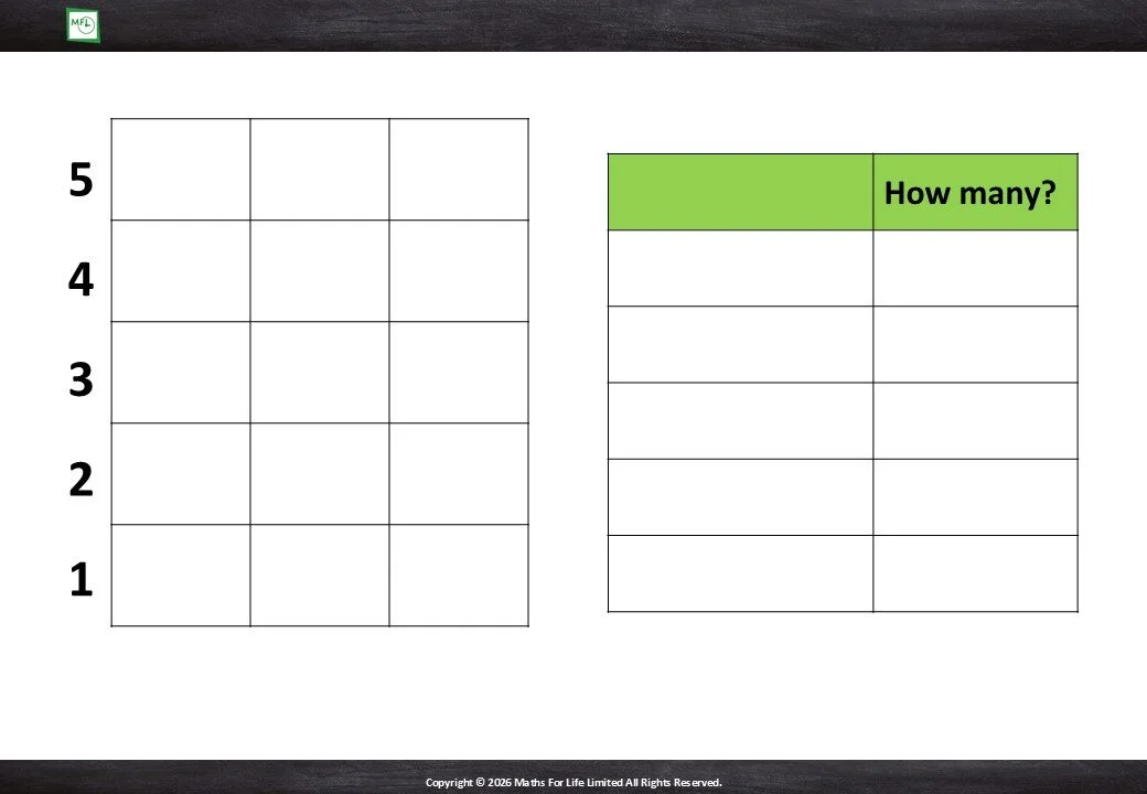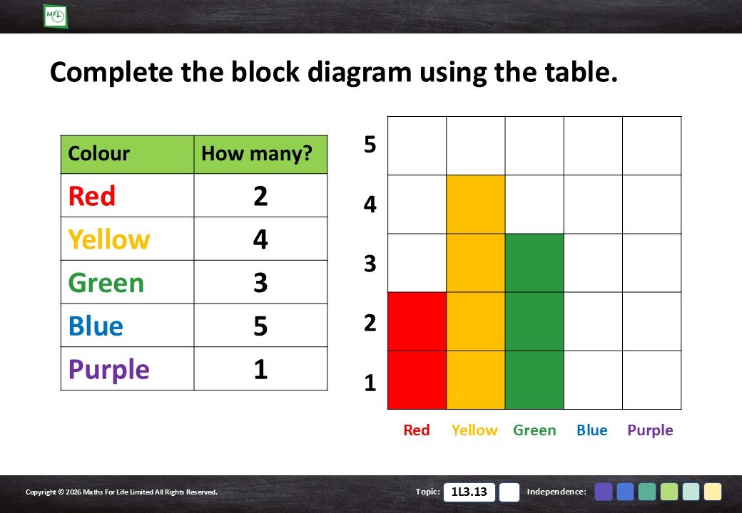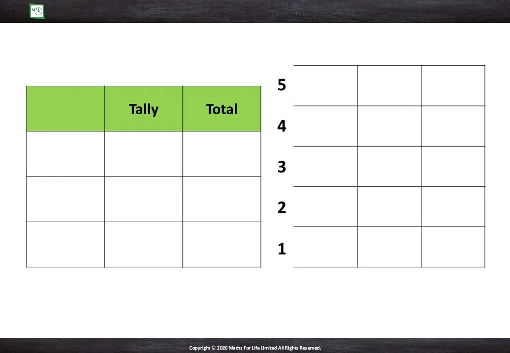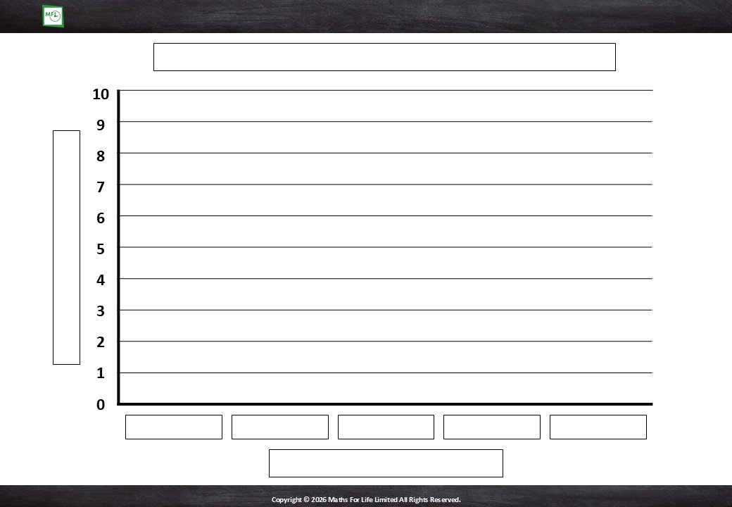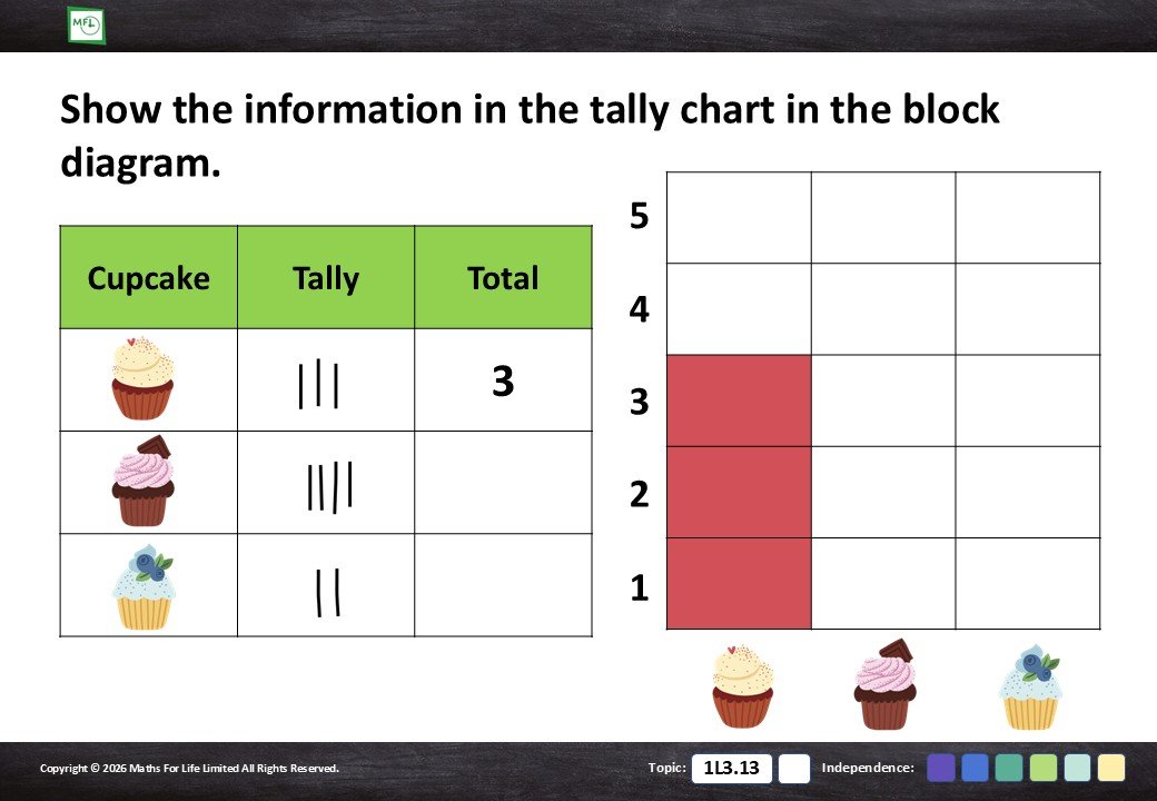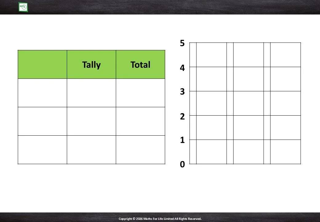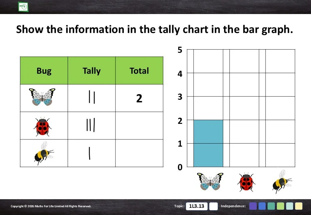 Introduce bar graphs. Transfer information from a tally chart to a bar graph. Numbers to 5.