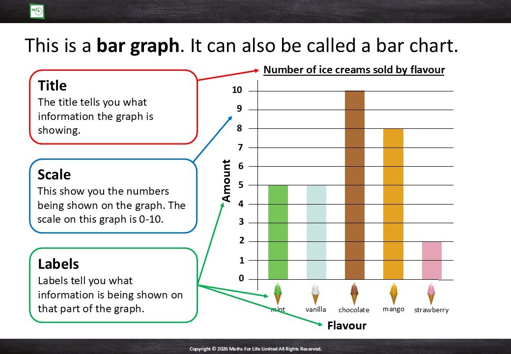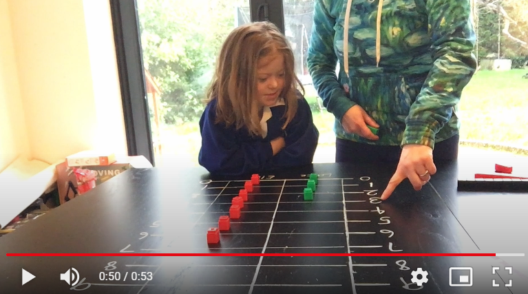 Karen introduces Ella to a chalkboard bar chart, using blocks to add data and explains how to read basic information from the scales.