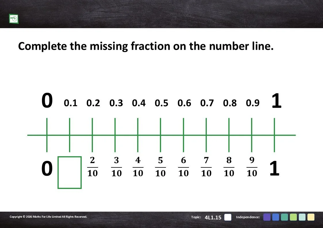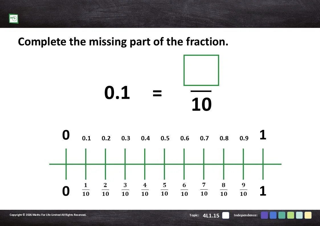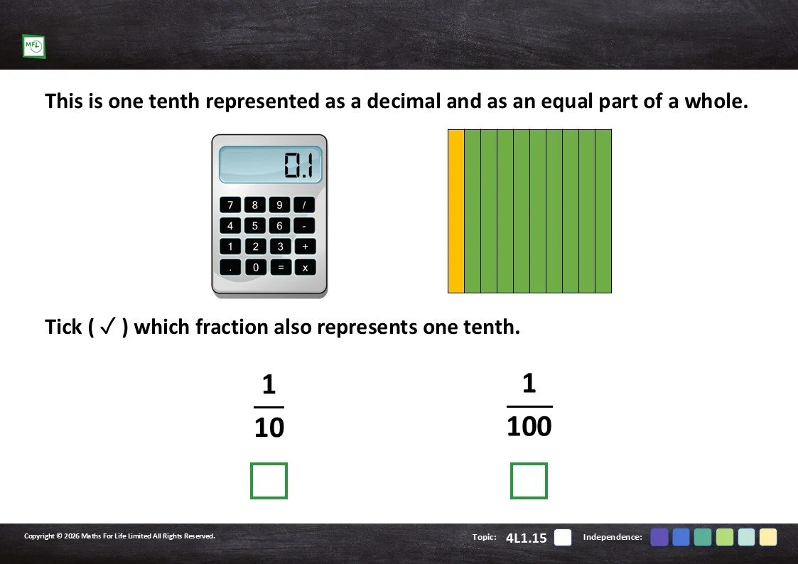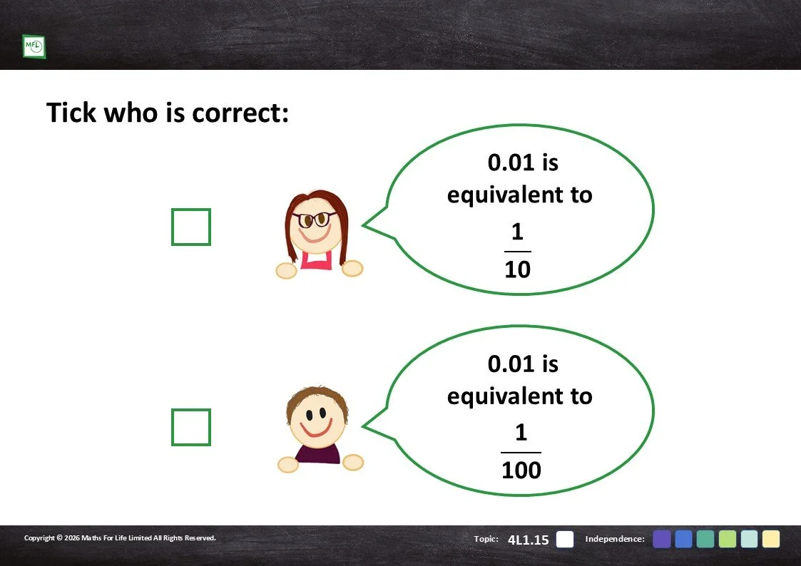 Practise recognising tenths and hundredths represented in different ways.