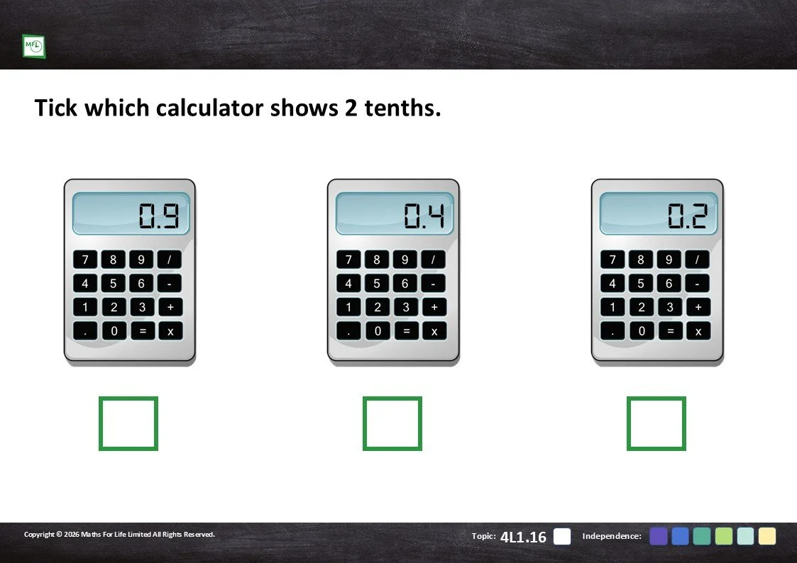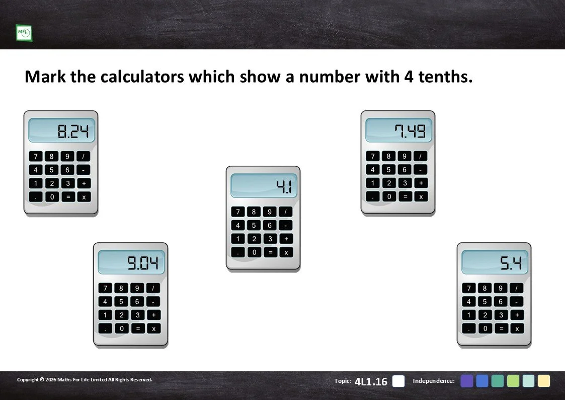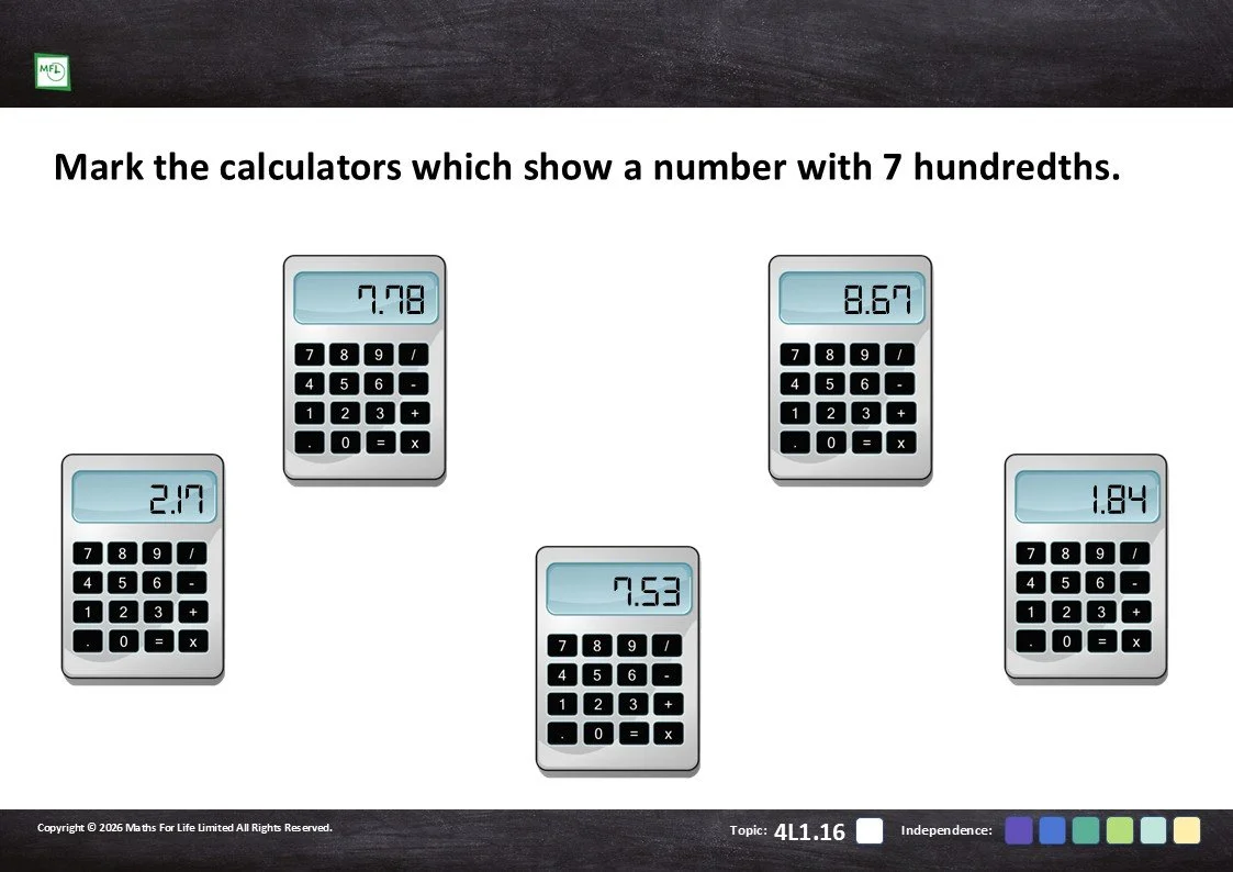 Identify which calculators show numbers with the correct amount of tenths and hundredths.