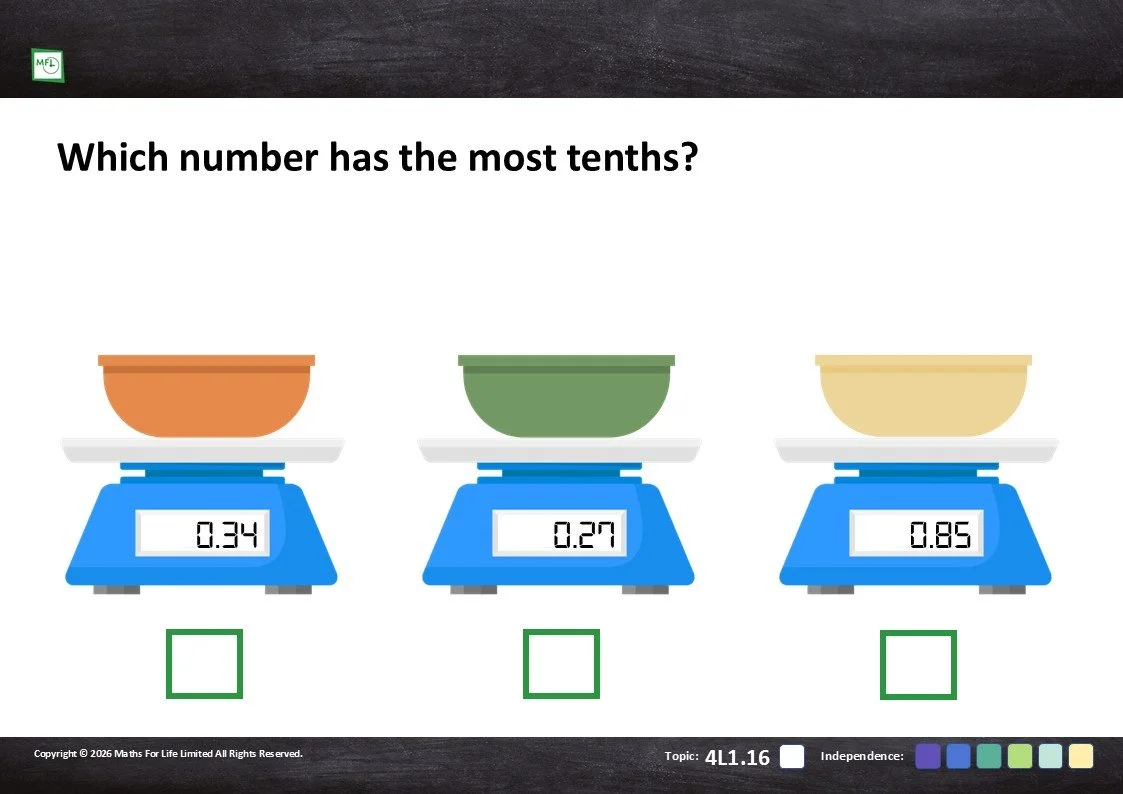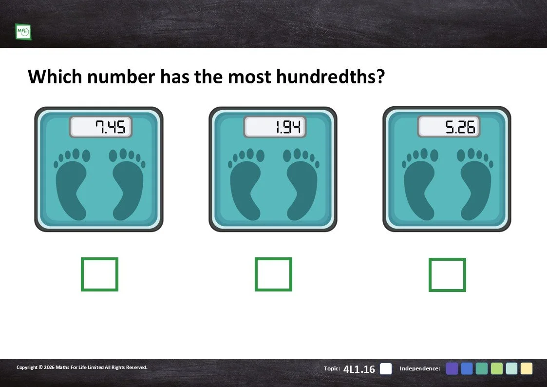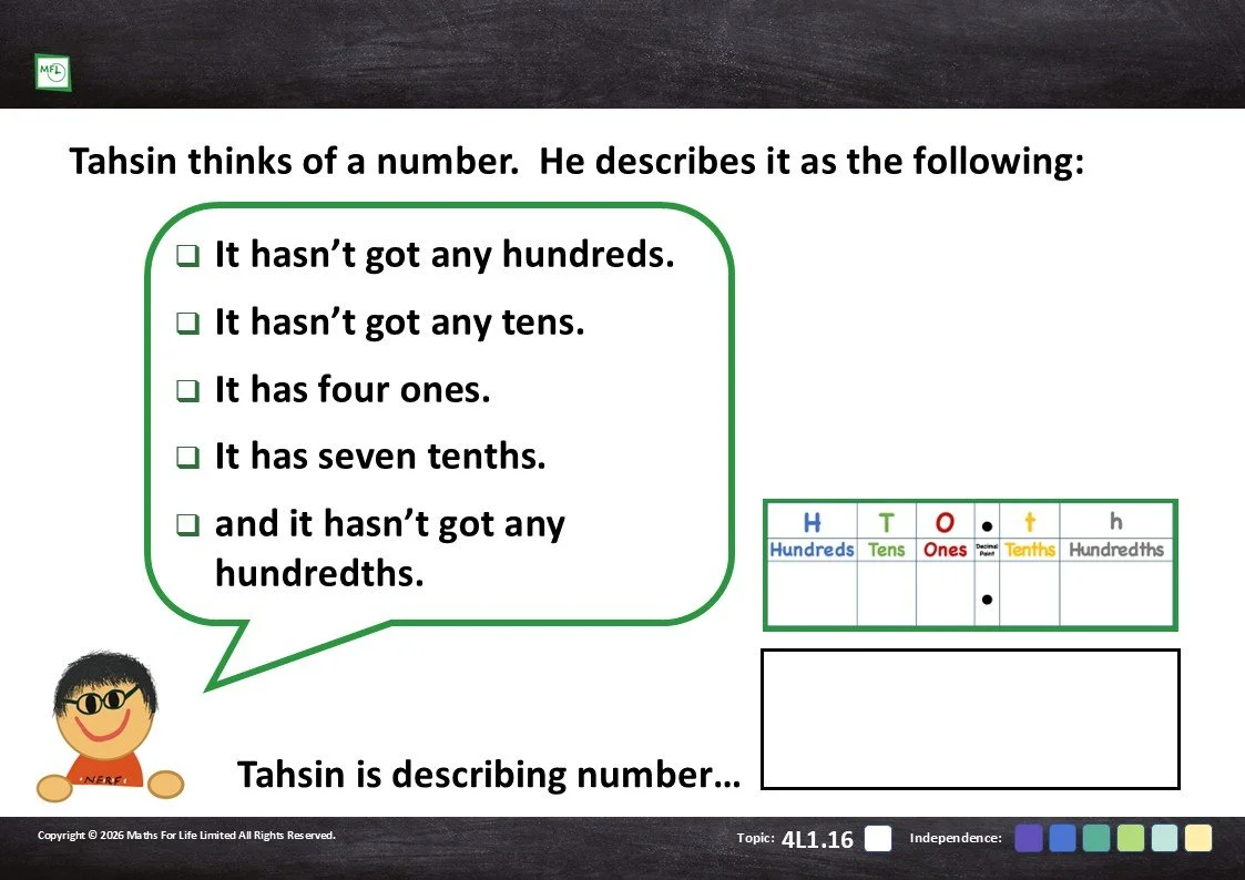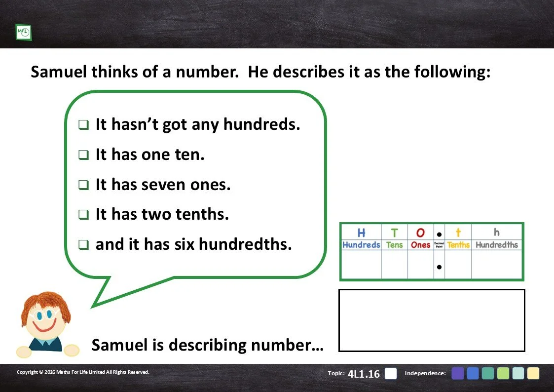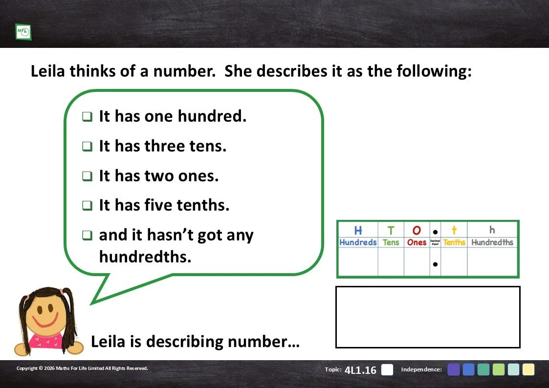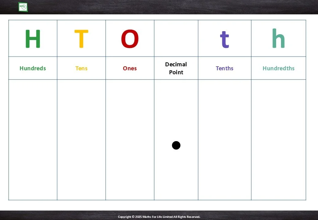 Practise writing hundreds, tens, ones, tenths and hundredths as decimal numbers.