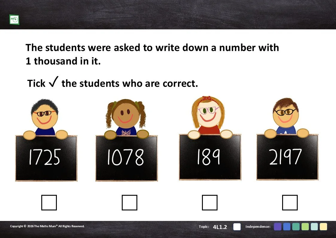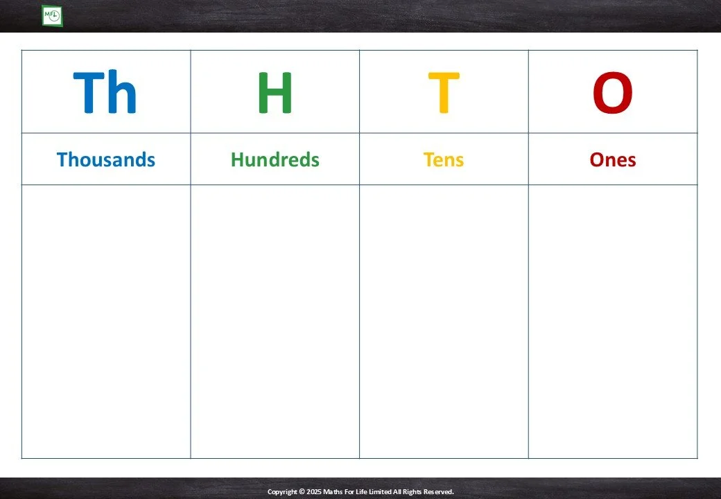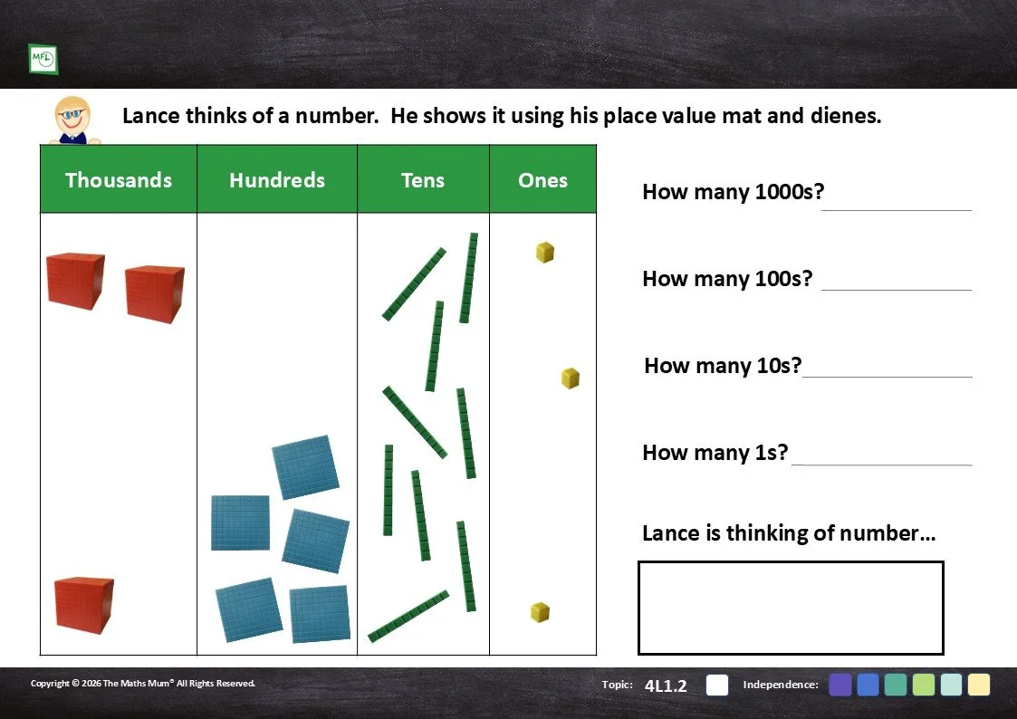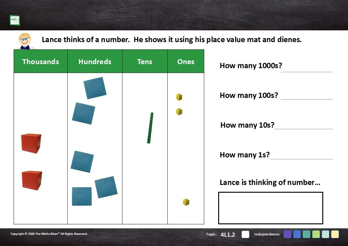 Place value mat looking at four-digit numbers and the respective place value of each numeral.