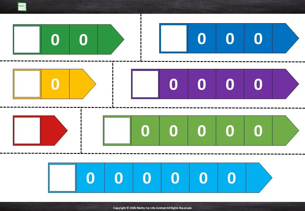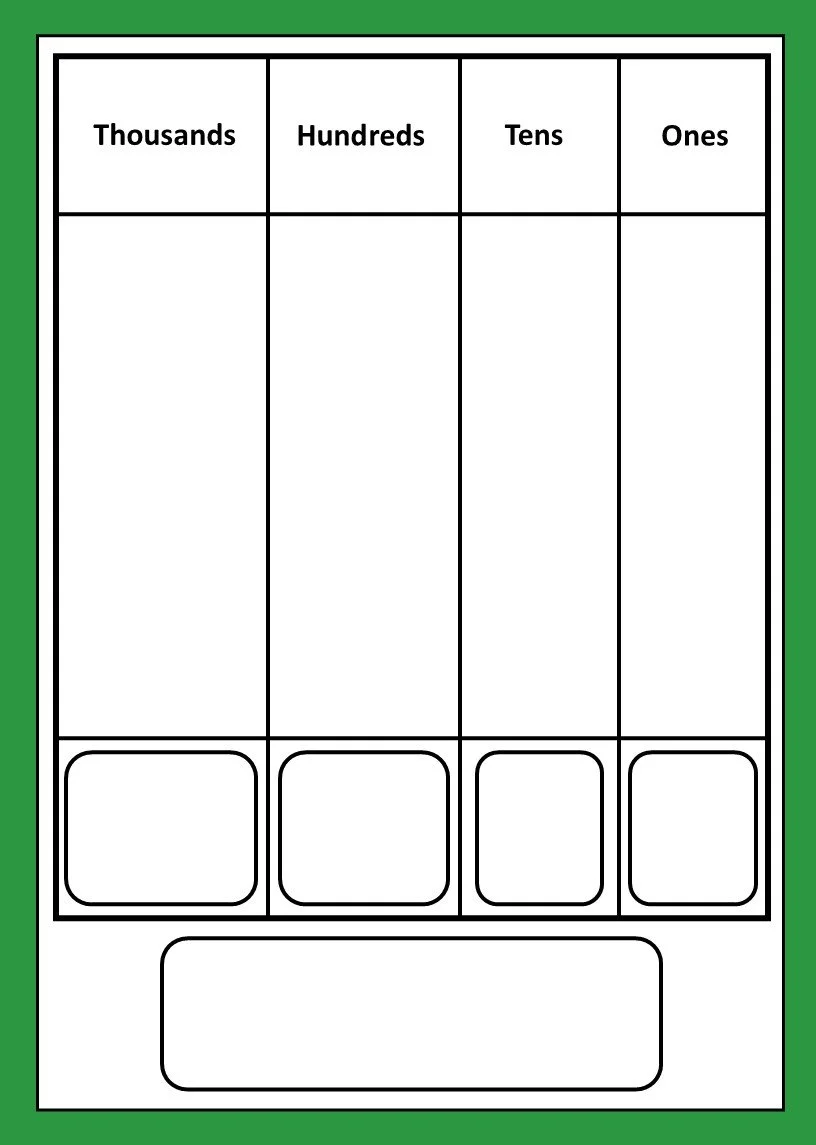 Traditional place value mat with thousands, hundreds, tens and ones. Can be used in conjunction with Dienes/Base 10 or counters.