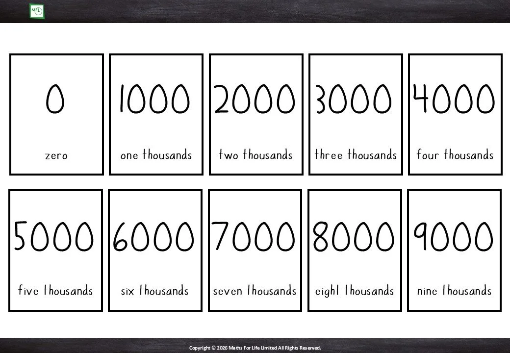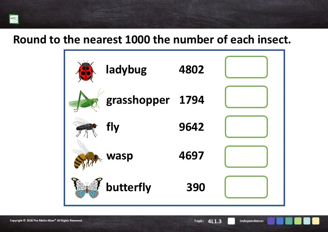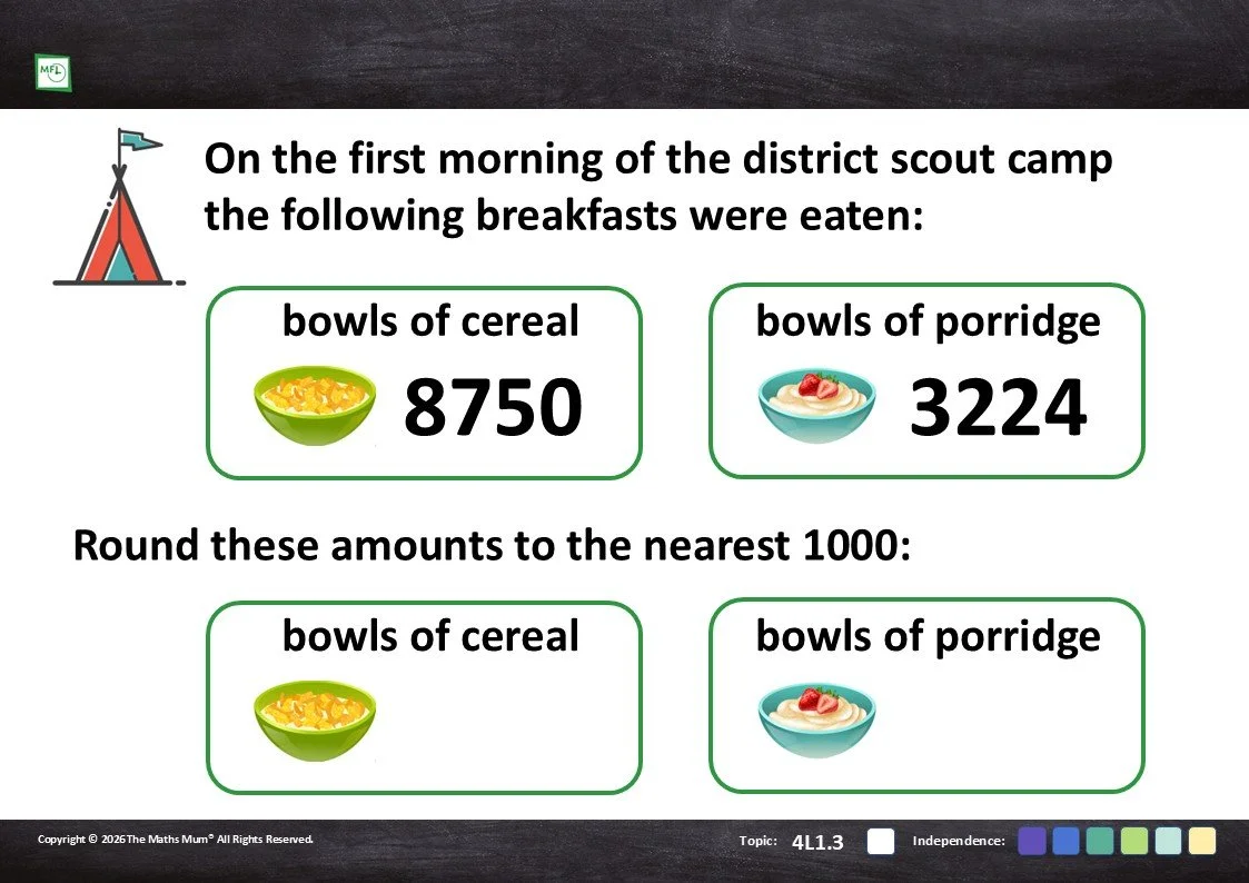 Round five amounts to the nearest 1000, with numbers up to 10,000.