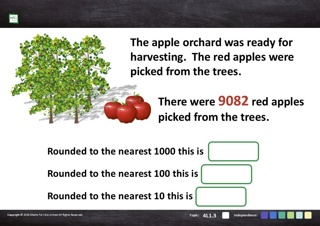 Round an amount to the nearest 10, 100 and 1000. Numbers up to 10,000.