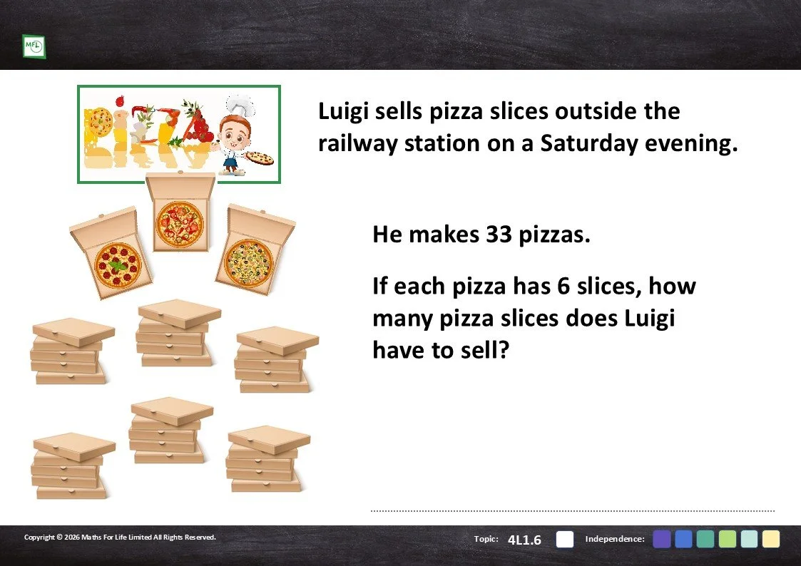 Practise multiplying a range of two-digit numbers up to 99 by a one-digit number.