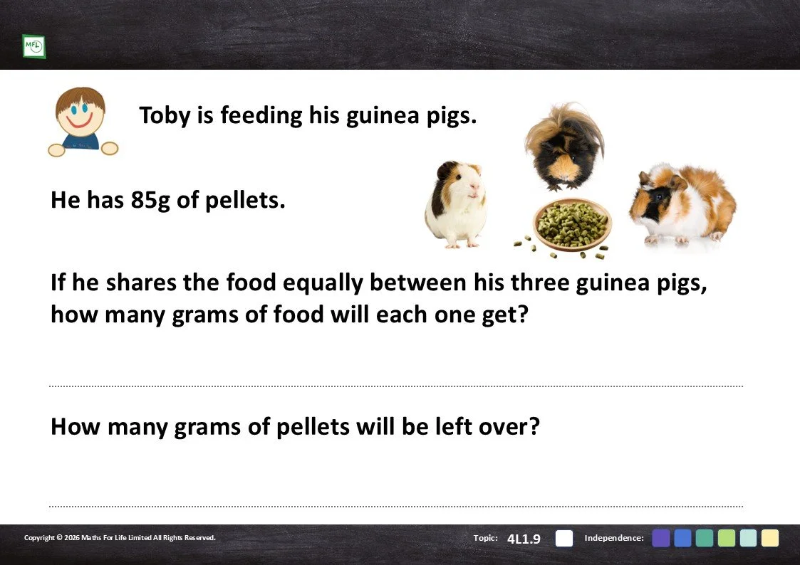 Practise dividing two-digit numbers by 2, 3, 4 and 5 whilst expressing a remainder.