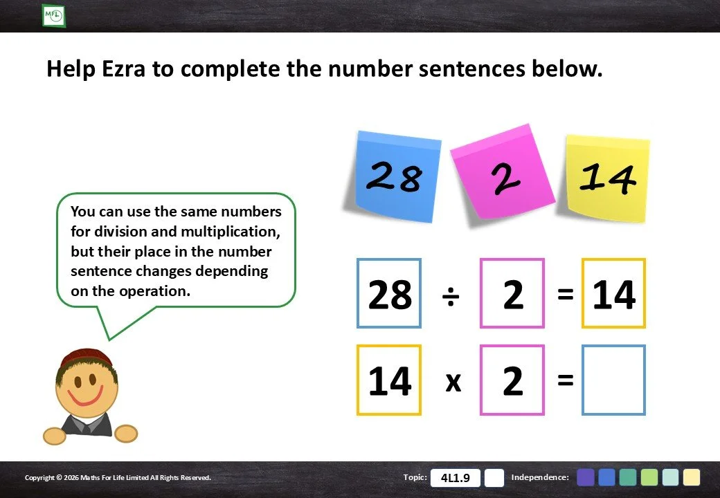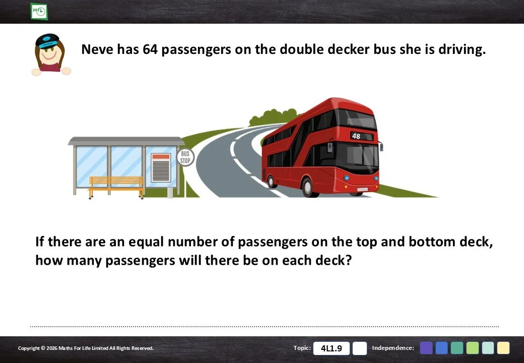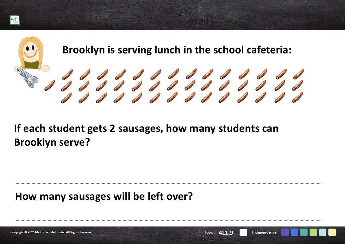 Practise dividing two-digit numbers by 2, 3, 4, 5, 6, 7, 8 and 9 whilst expressing a remainder.