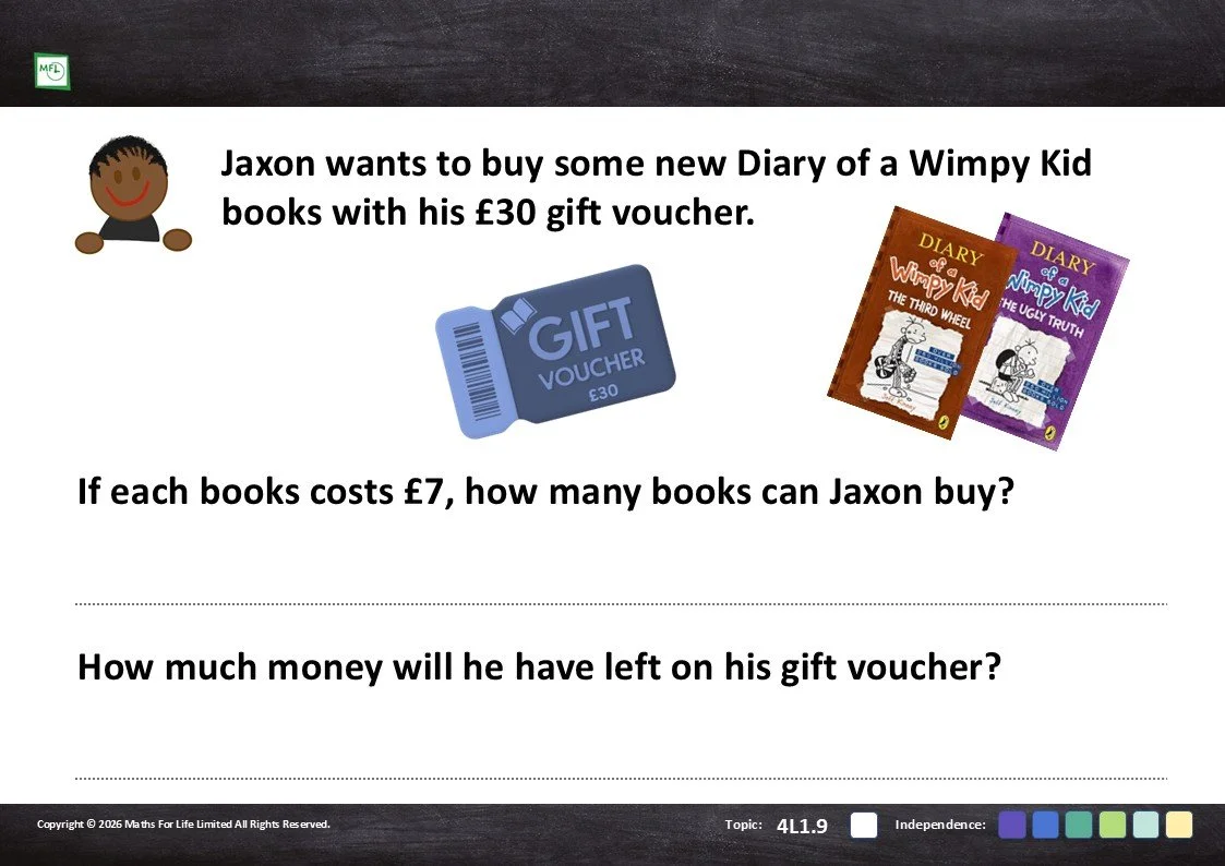 Practise dividing two-digit numbers by 6, 7, 8 and 9 whilst expressing a remainder.