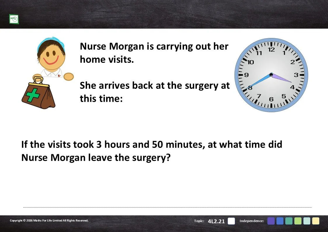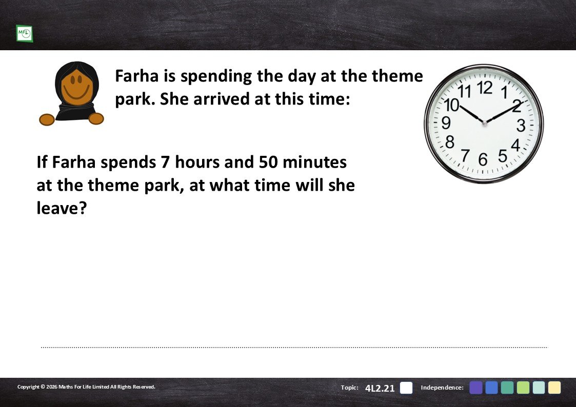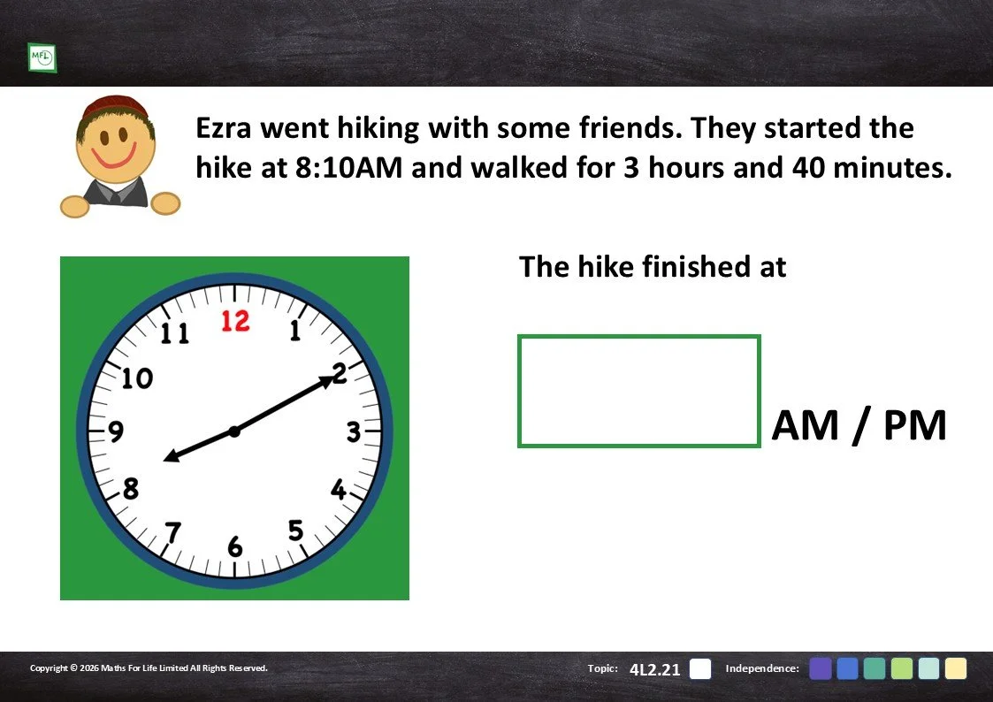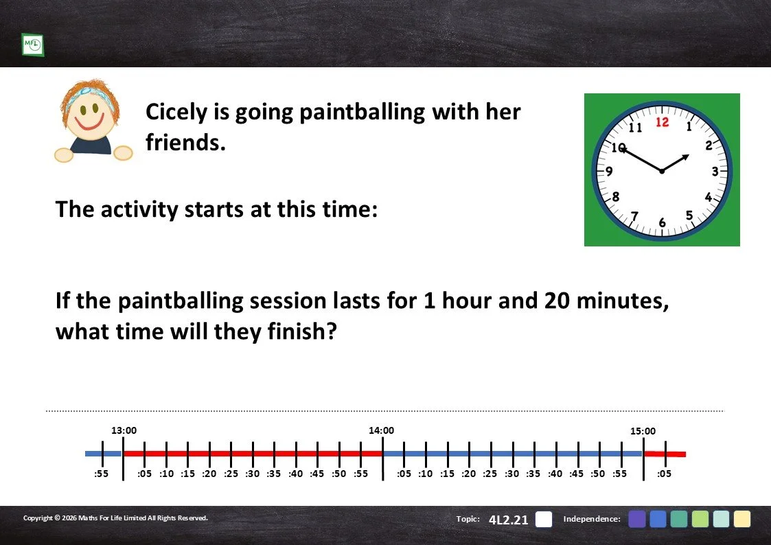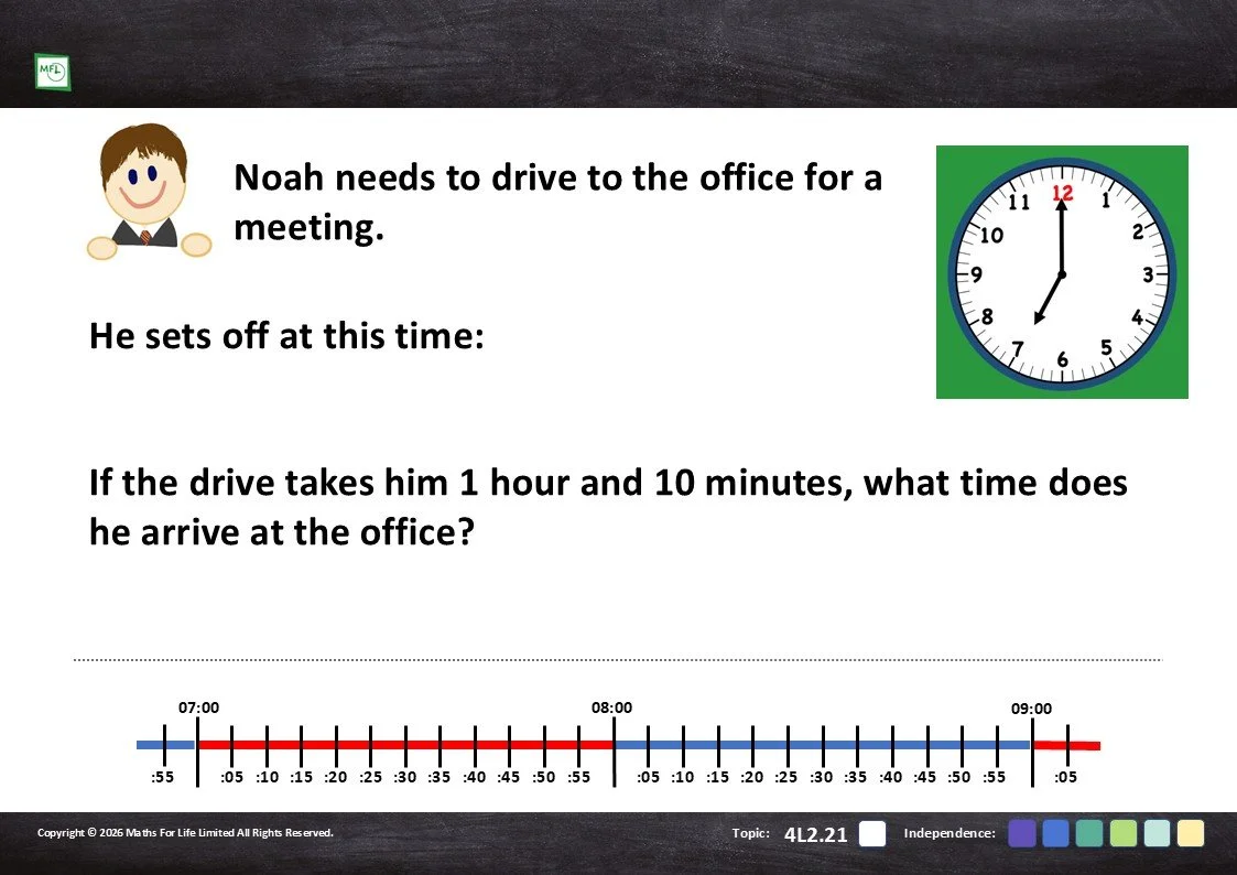 Calculate time in the future with minutes and hours, to the o’clock time. Builds in difficulty with timeline.