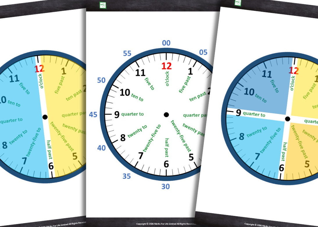 Calculate time in the past with minutes and hours, from the o’clock time. Builds in difficulty with timeline.
