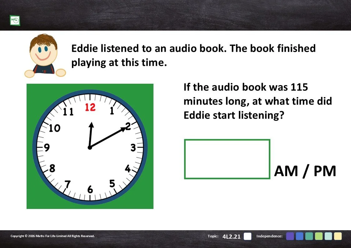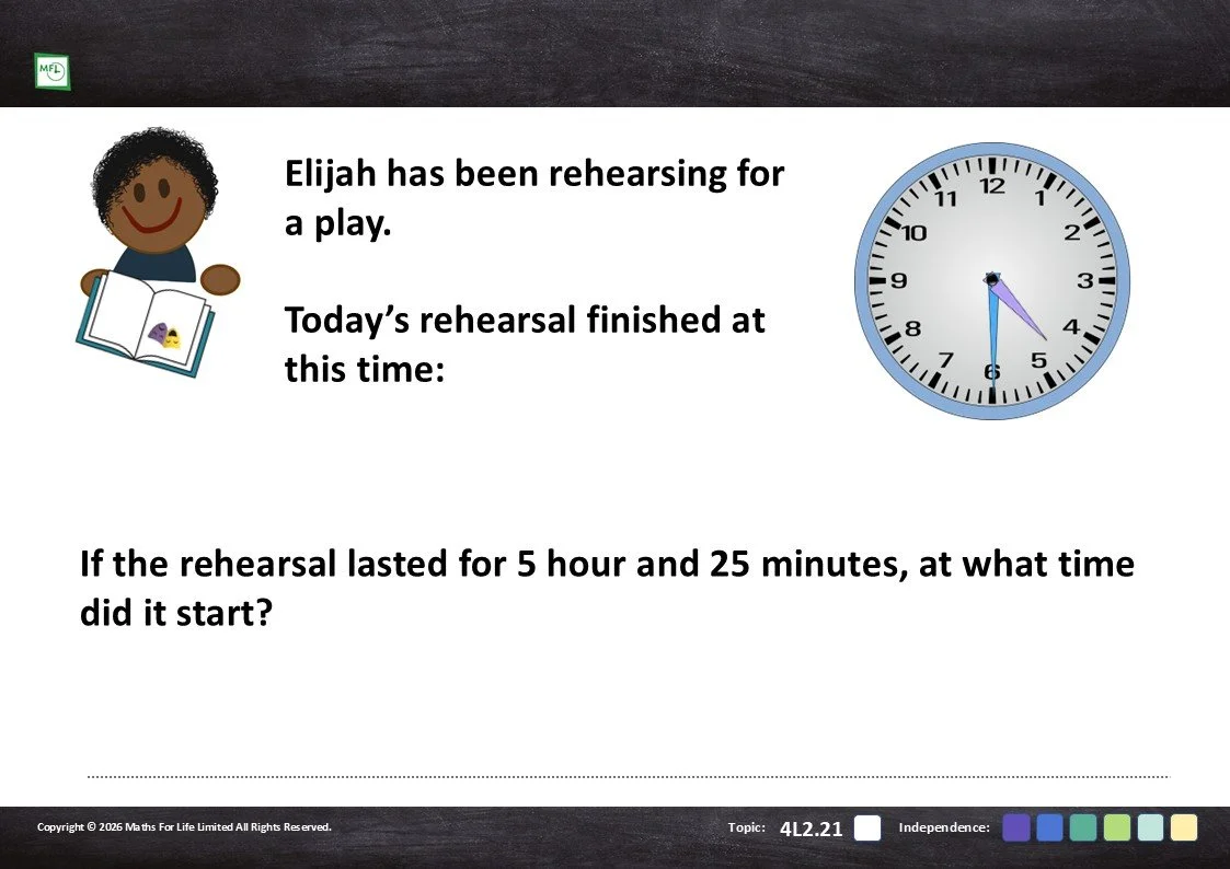 Calculate time in the past with minutes and hours, to the o’clock time. Builds in difficulty with timeline.