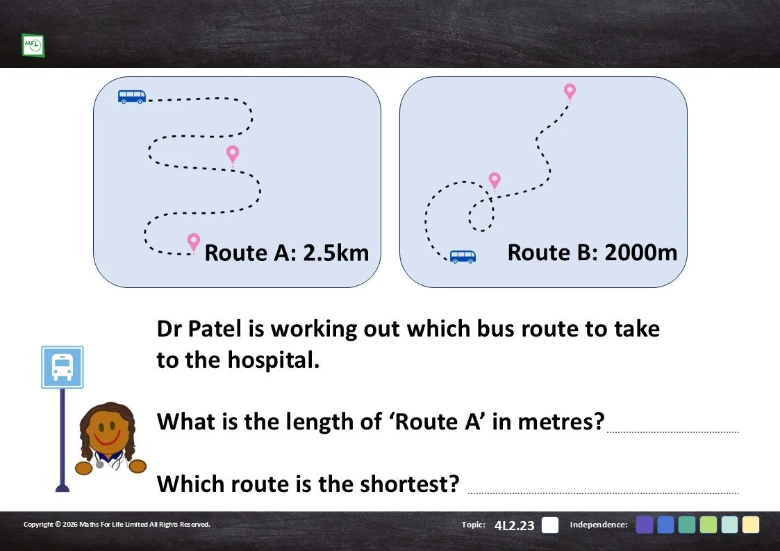Practise converting between metres and kilometres and identifying the longest and shortest route.