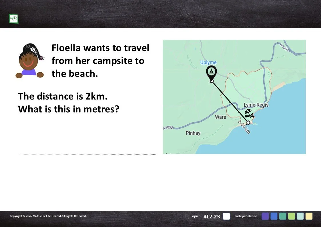 Practise converting between metres and kilometres using distances on a map.