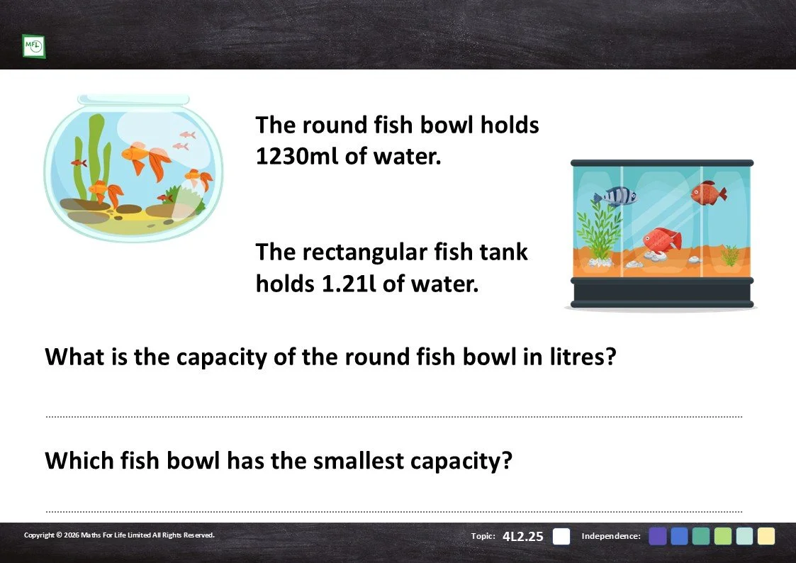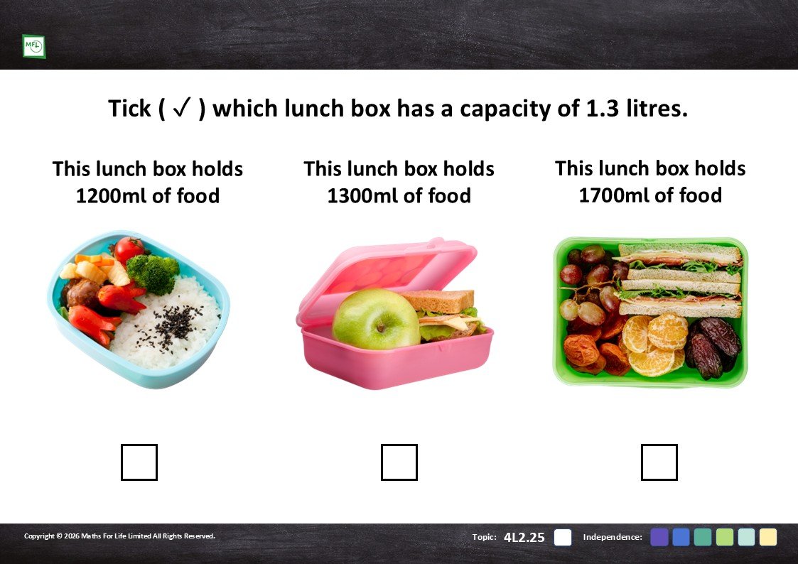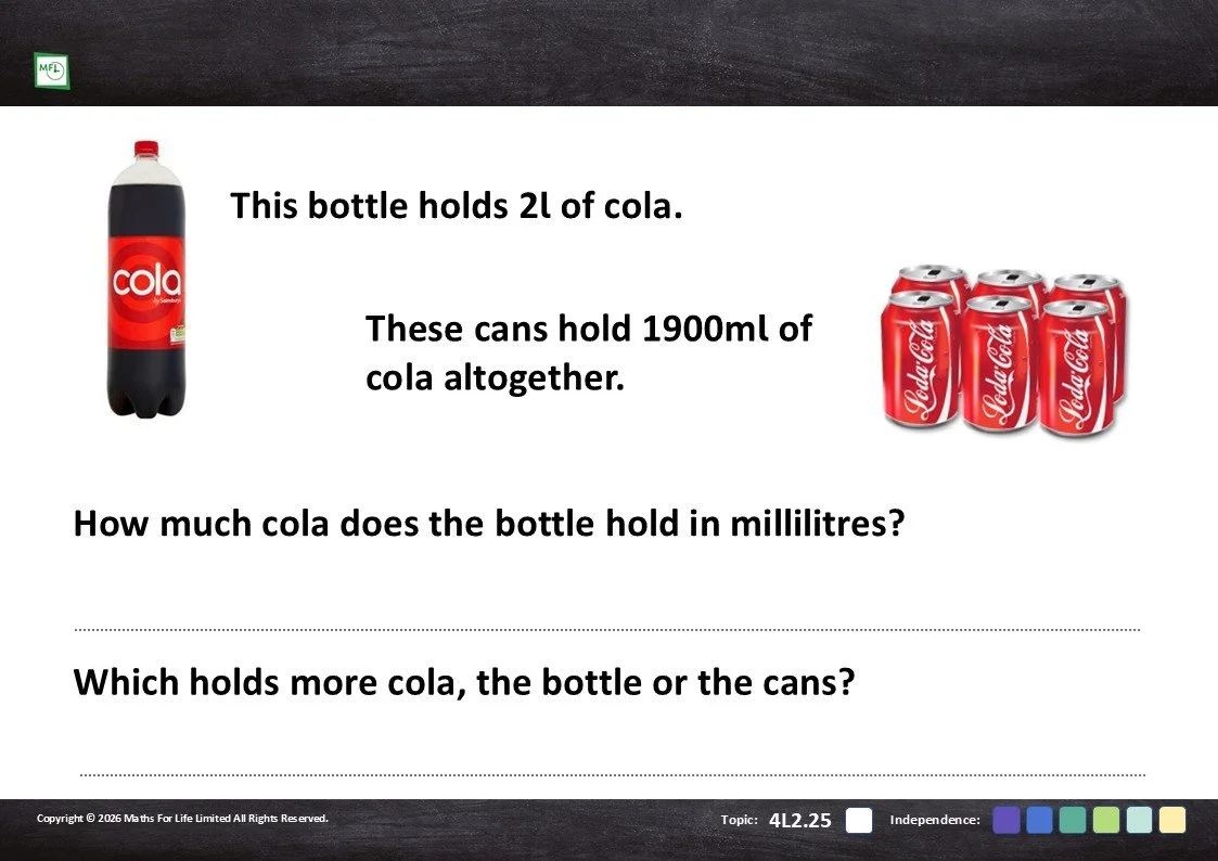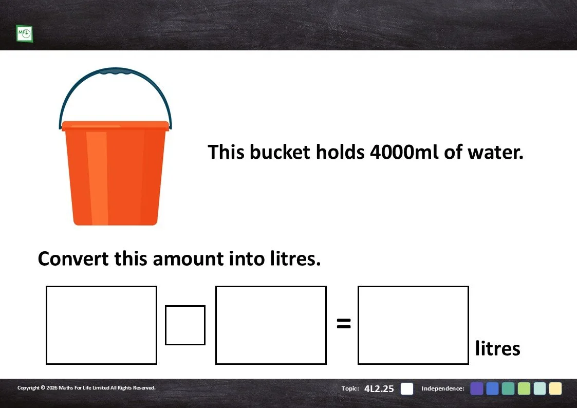 Practise converting litres to millilitres, starting with whole numbers and moving to decimals.