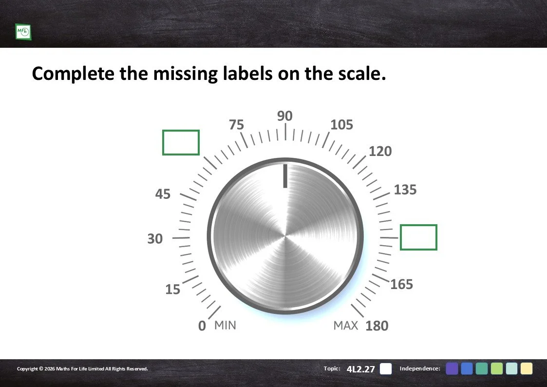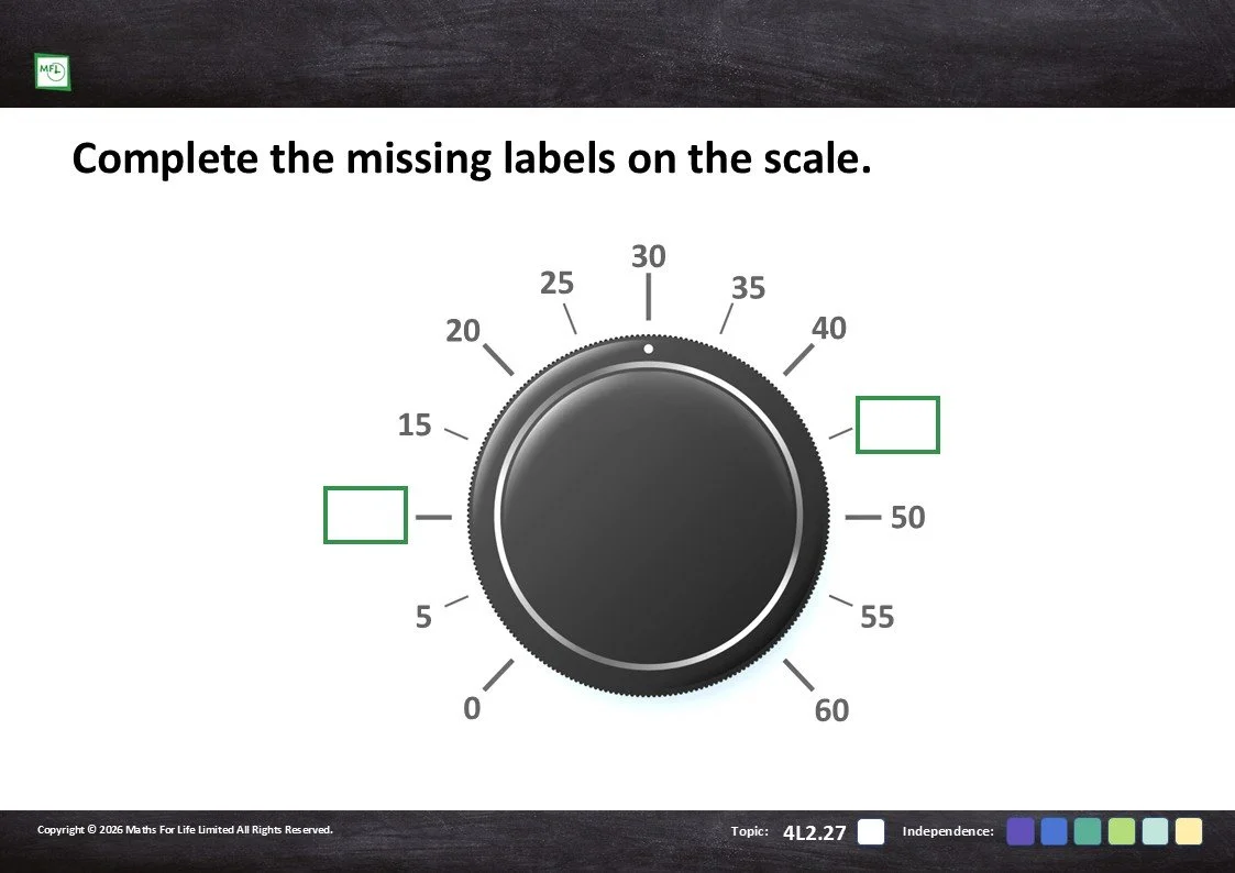 Read circular scales with intervals going up in 5s, 10s and 2s and complete the missing labels.