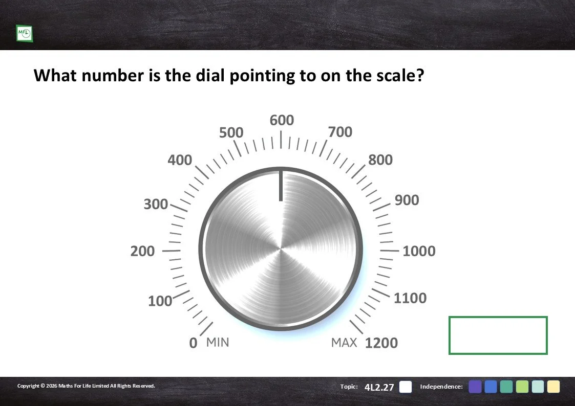 Read circular scales with intervals going up in 15s, 20s, 25s, 100s and 1000s and complete the missing labels.