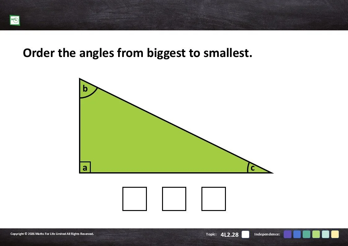 Practise ordering angles by size, firstly as separate angles and then within a shape.