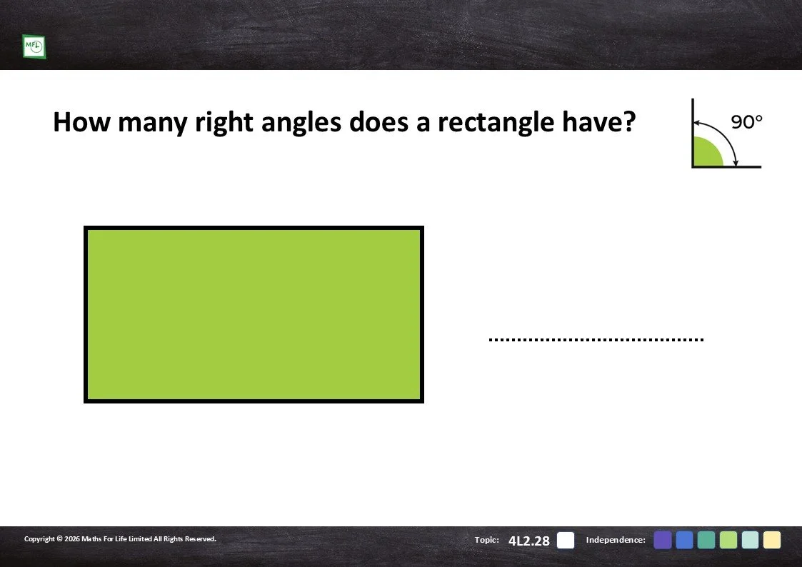 Identify right angles in common 2-D shapes, then on objects and finally within pictures.
