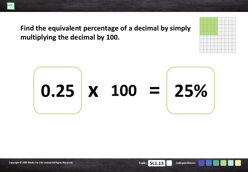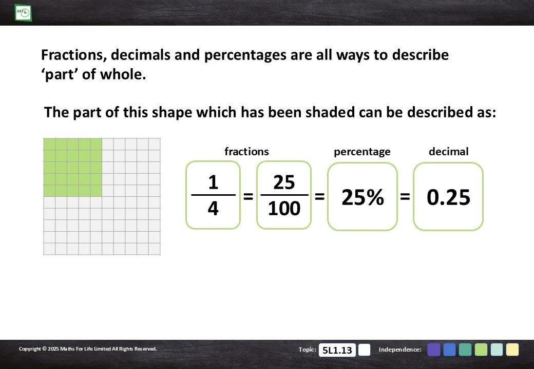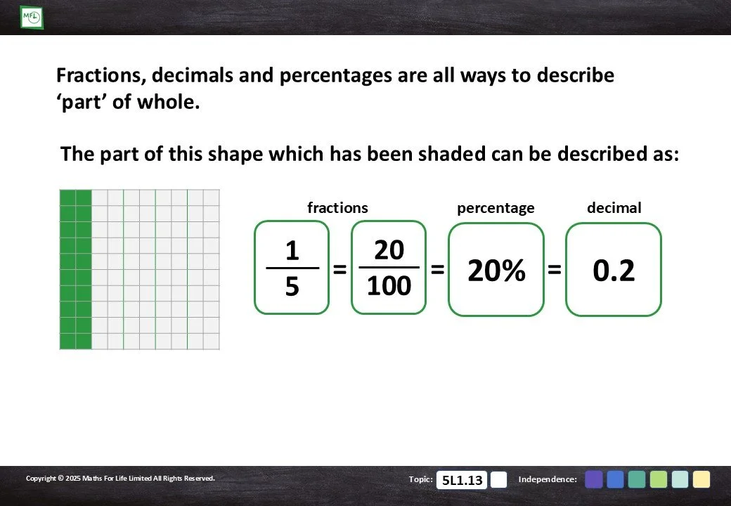 5L1.13 Recognise fraction, decimal and percentage equivalents