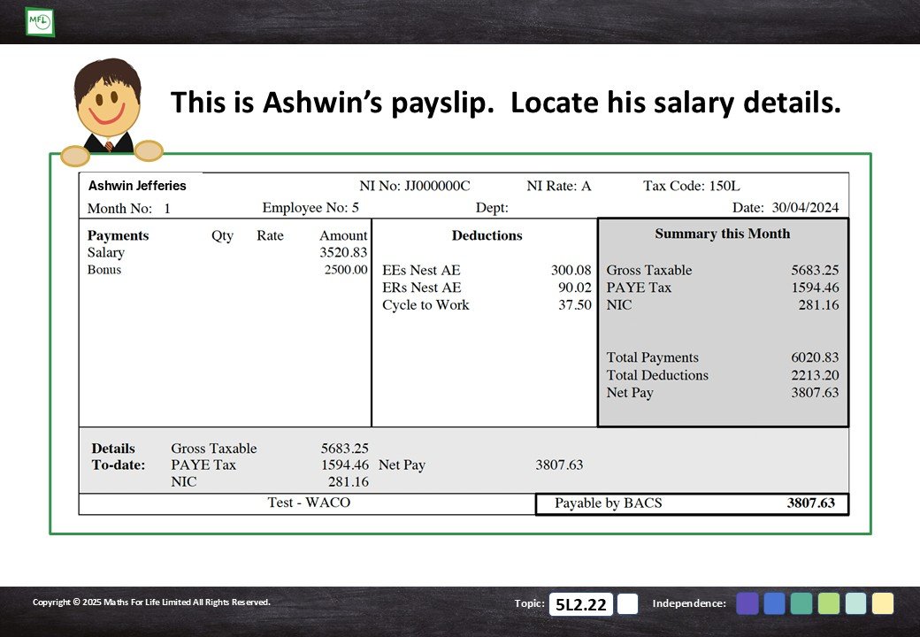 Introduction to simple payslips. Identify elements such as net pay, hours worked and tax code