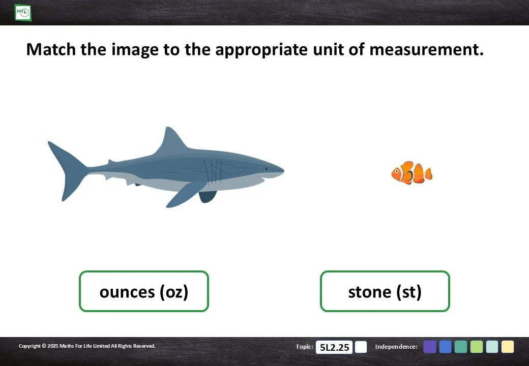 Introduction to ounces, pounds and stone, building to the application of these units.