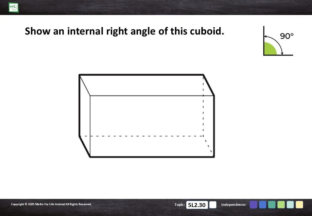 Explore internal right angles of 3-D shapes - cubes and cuboids.