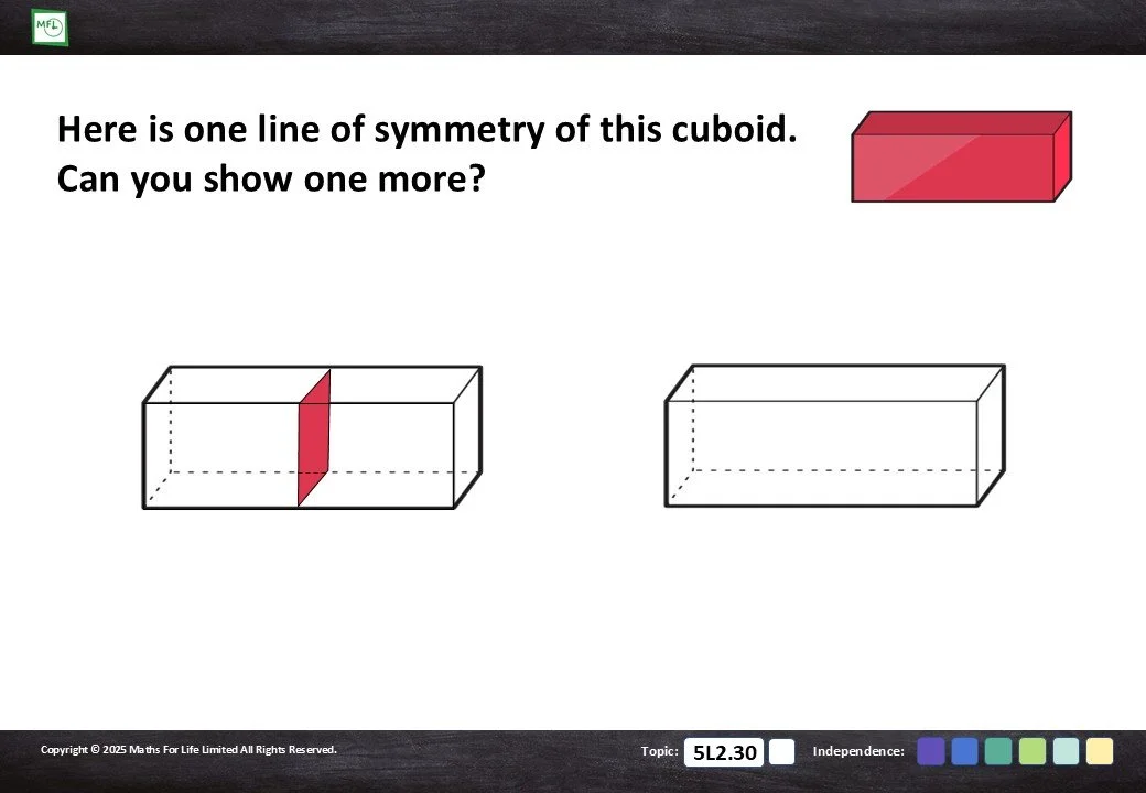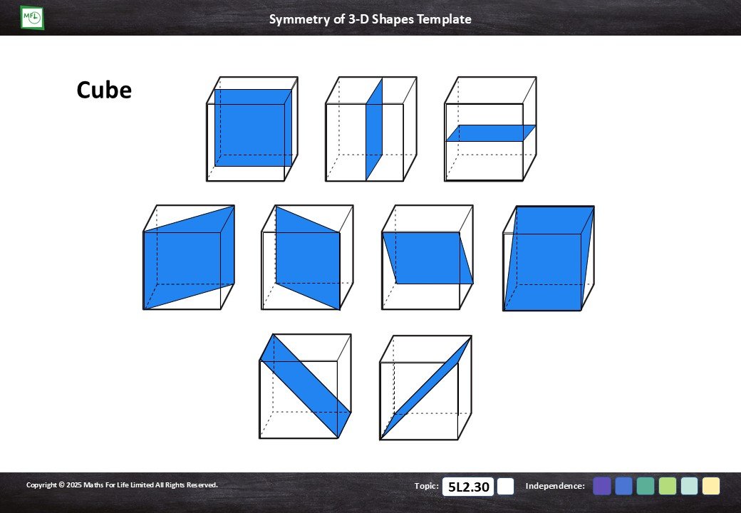 Introduction to lines, or planes, of symmetry in 3-D shapes - cubes, cuboids and square-based pyramids.