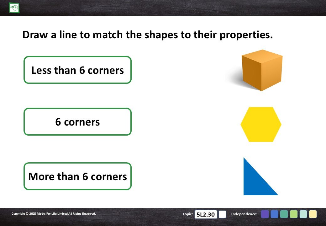 Identify 2-D and 3-D shapes using a range of different properties.