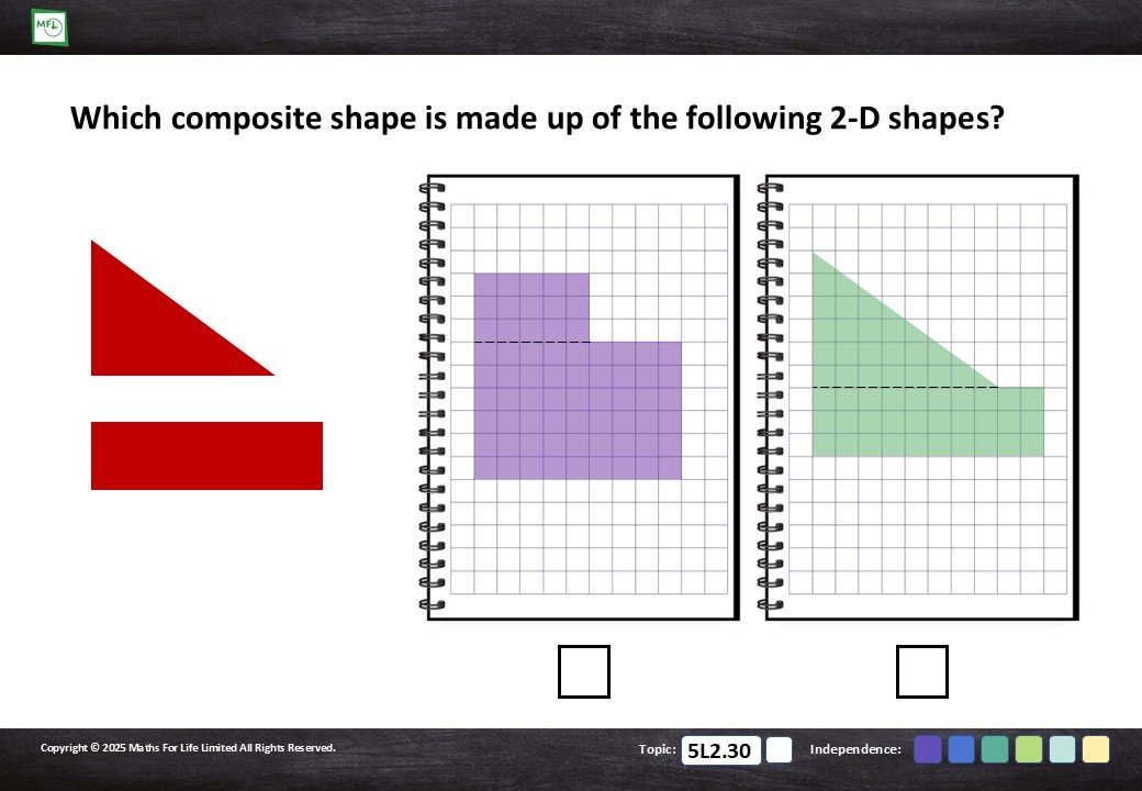 Extend the knowledge of shape properties to include lines of symmetry, right angles, internal angles and composite shapes.
