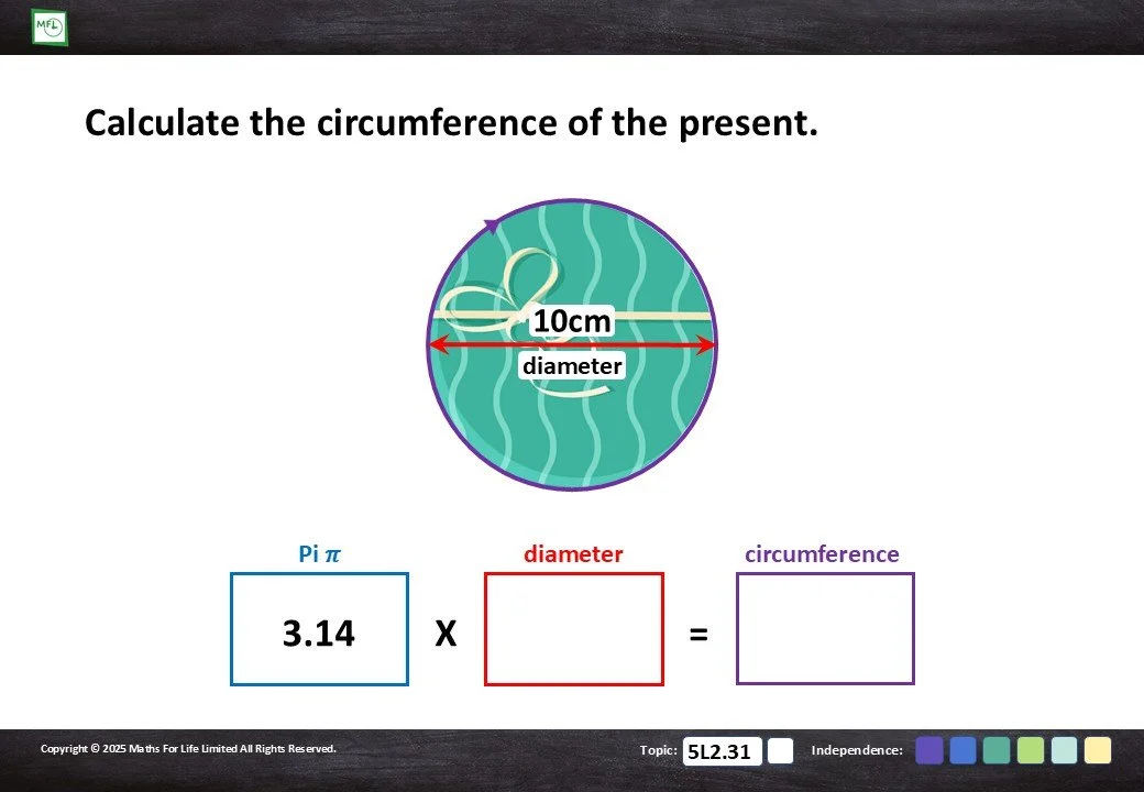 Introduction to calculating the circumference of a circle, including terms ‘diameter’ and ‘pi’.