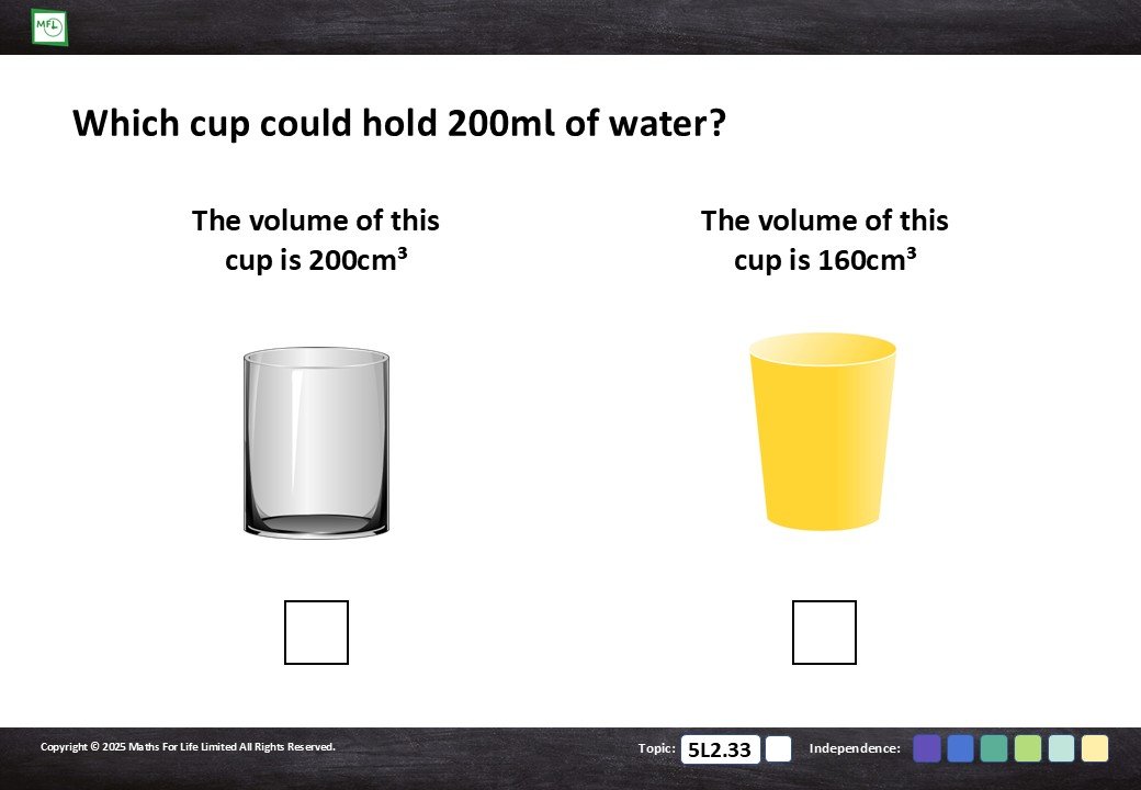 Understand that one centimetre cubed takes up the same space as one millilitre of liquid.