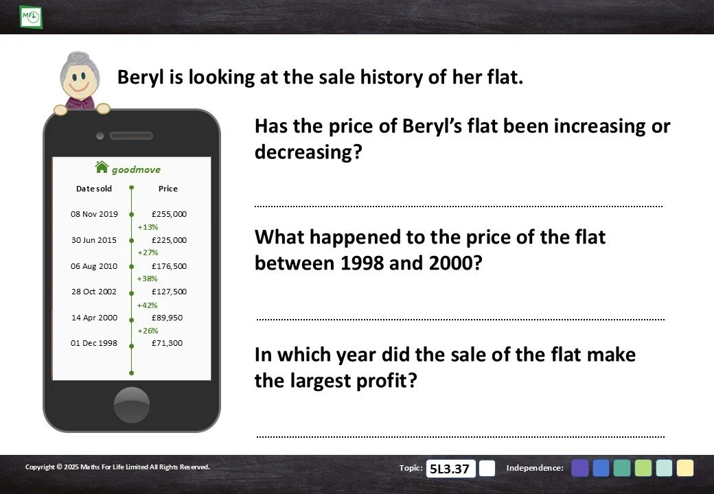 Tackling more complex lists, tables, diagrams, charts and simple line graphs that use both whole and decimal numbers.