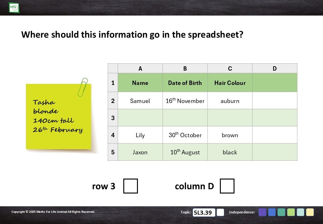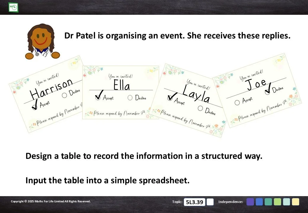 Learn how to use a spreadsheet to design a table, collect data and display information.