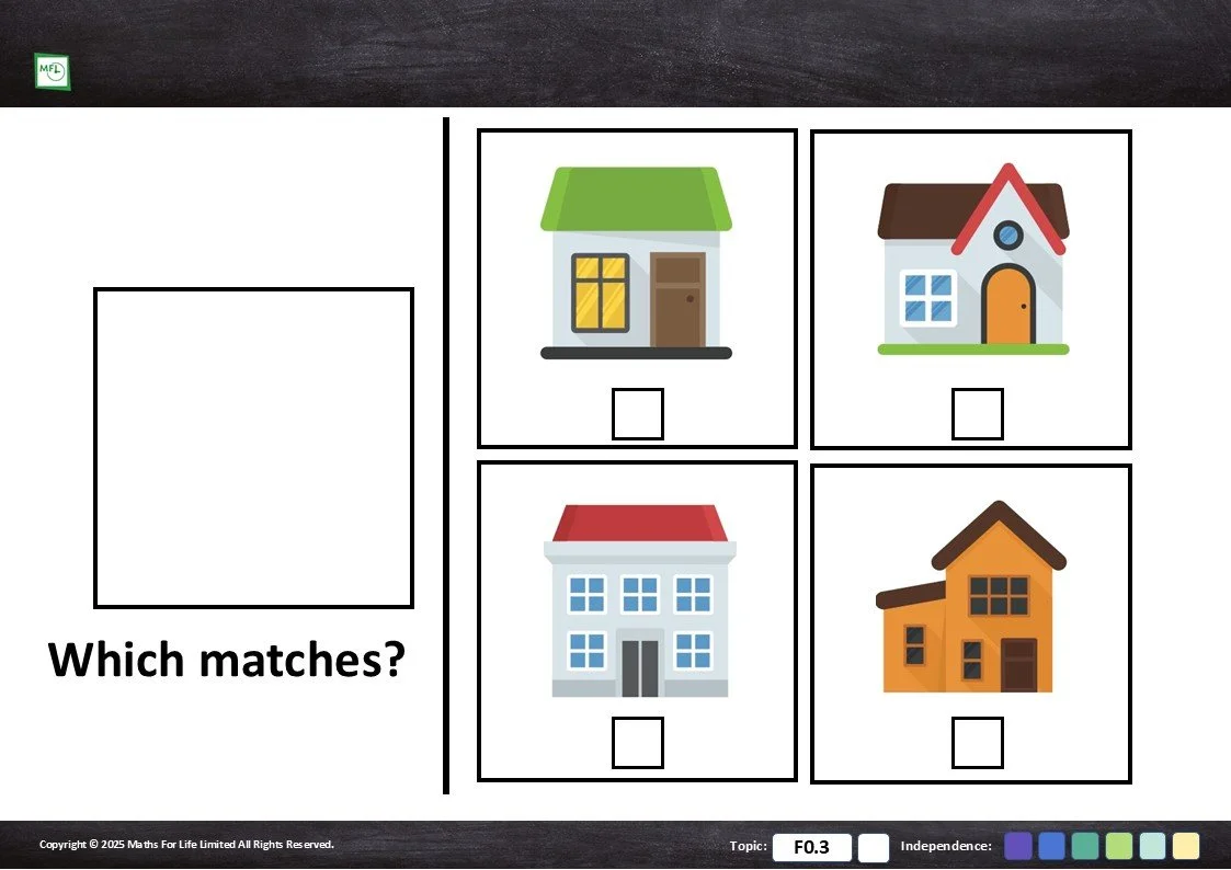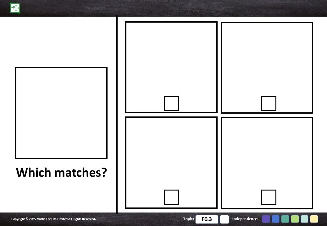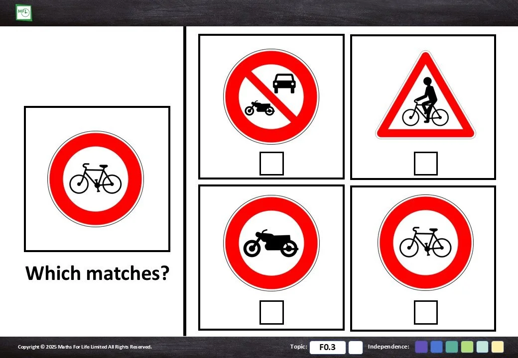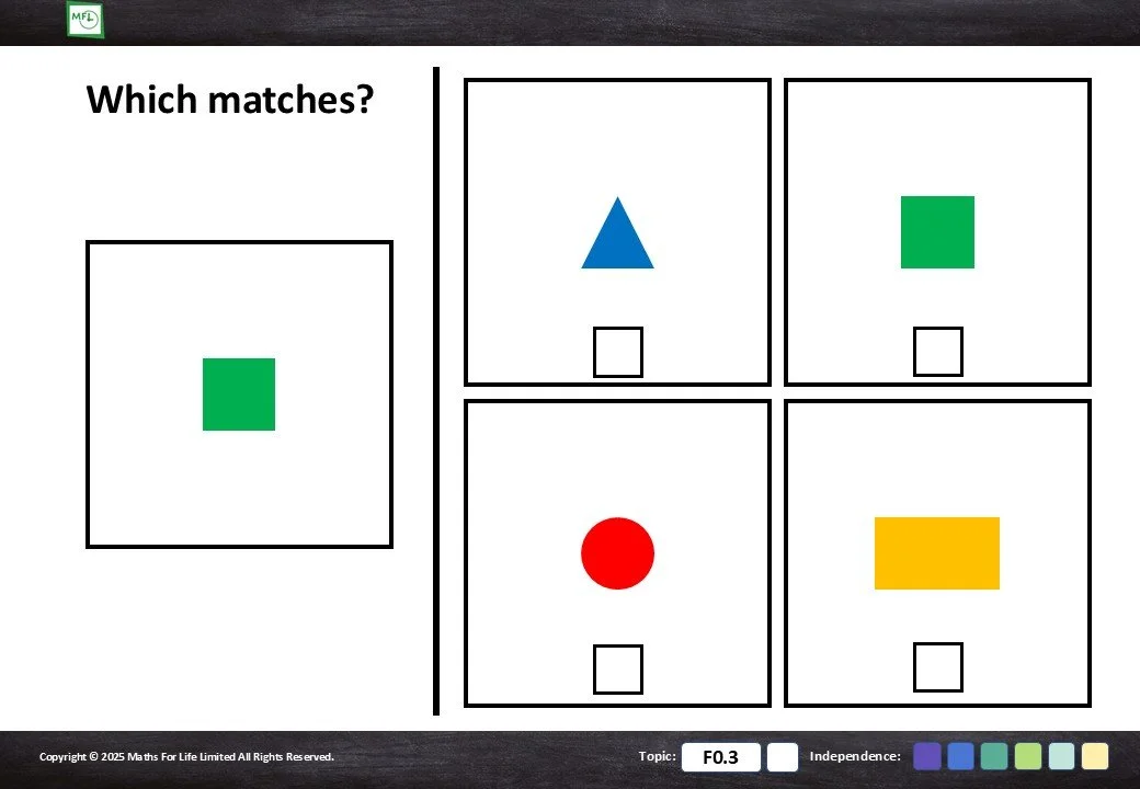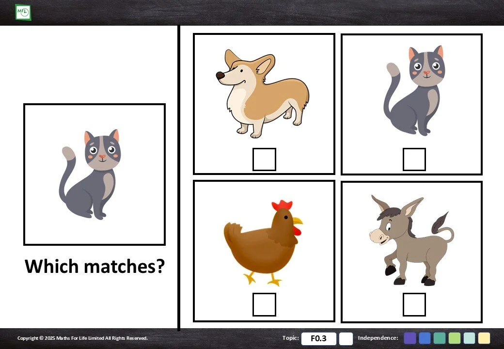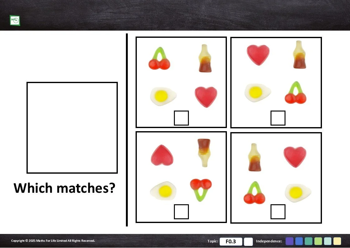 Identify which real life item matches from 4 options on a matching mat. What could you use?