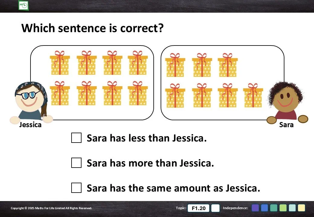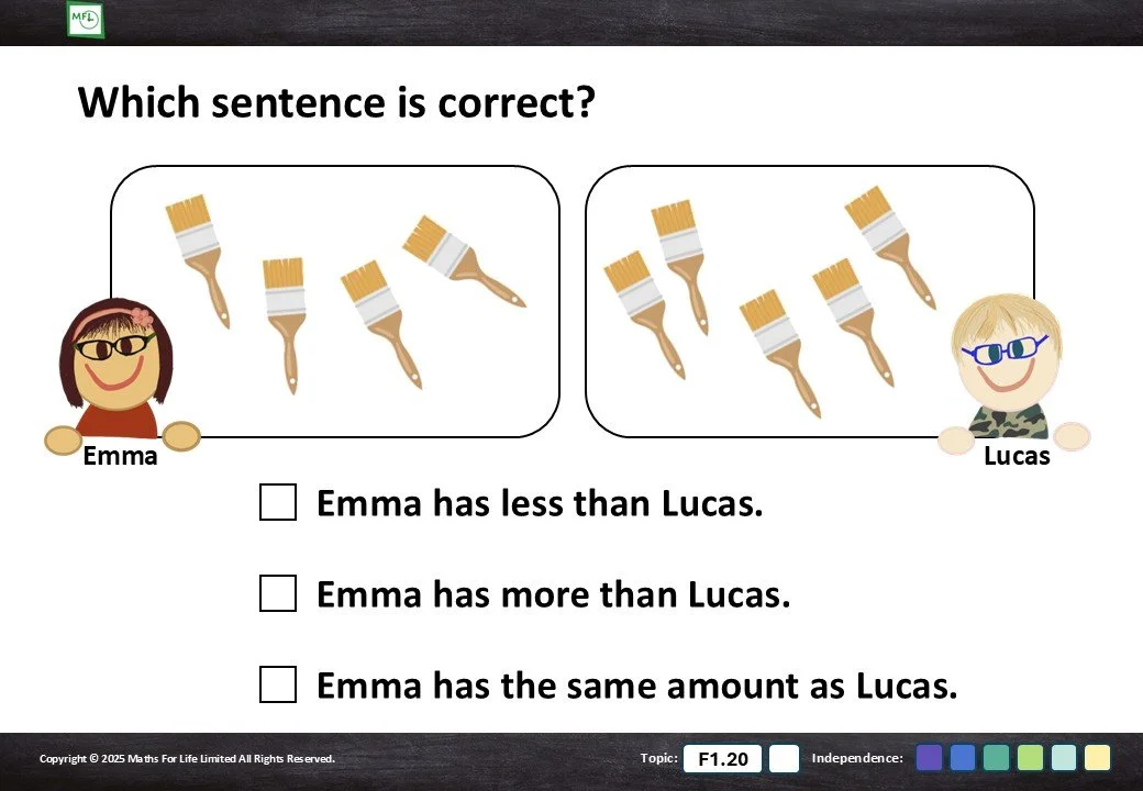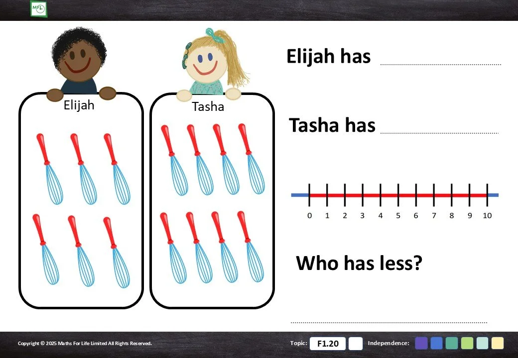Karen and Ella discuss who has more or less. Deciding who has more or less and writing the answer in words.