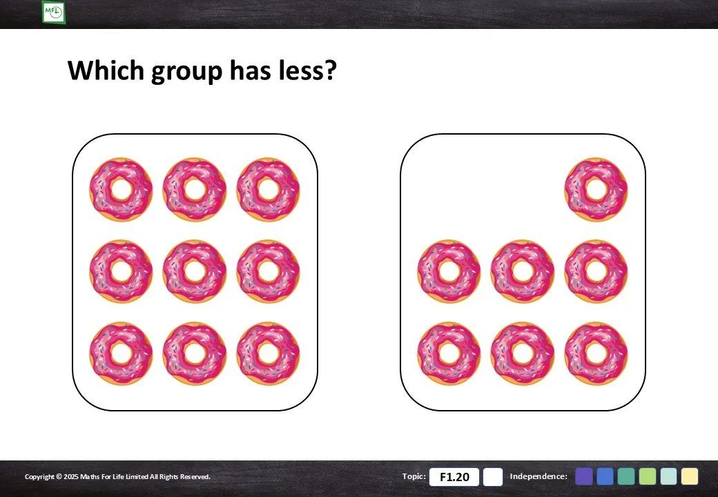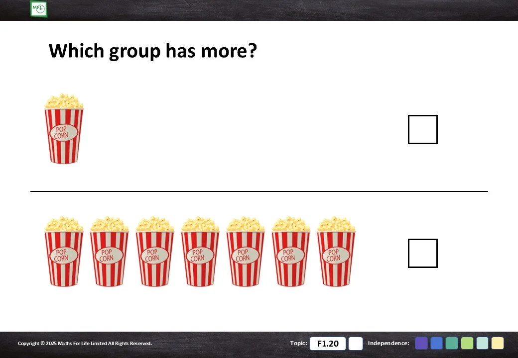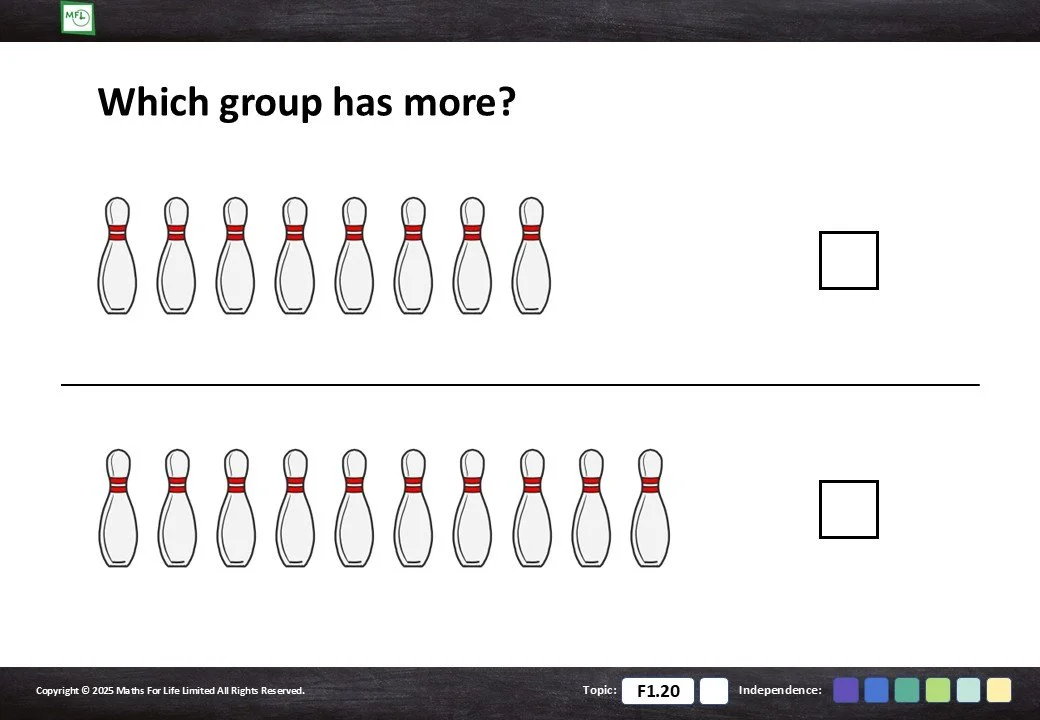 Identify the group that has more or less by comparing objects. Numbers up to 10.